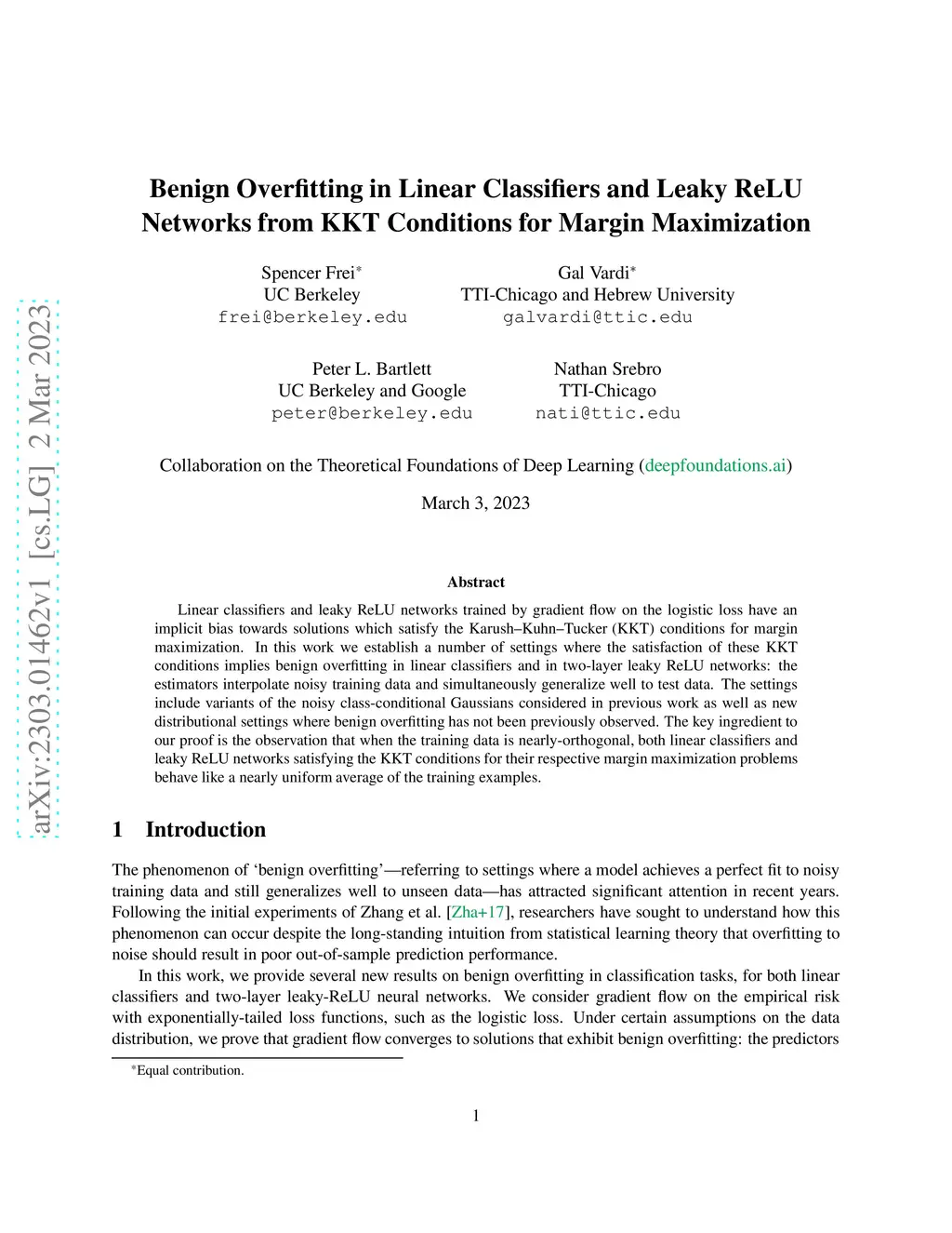 Linear classifiers and leaky ReLU networks trained by gradient flow on the logistic loss have an implicit bias towards solutions which satisfy the Karush--Kuhn--Tucker (KKT) conditions for margin maximization. In this work we establish a number of settings where the satisfaction of these KKT conditions implies benign overfitting in linear classifiers and in two-layer leaky ReLU networks: the estimators interpolate noisy training data and simultaneously generalize well to test data. The settings include variants of the noisy class-conditional Gaussians considered in previous work as well as new distributional settings where benign overfitting has not been previously observed. The key ingredient to our proof is the observation that when the training data is nearly-orthogonal, both linear classifiers and leaky ReLU networks satisfying the KKT conditions for their respective margin maximization problems behave like a nearly uniform average of the training examples.