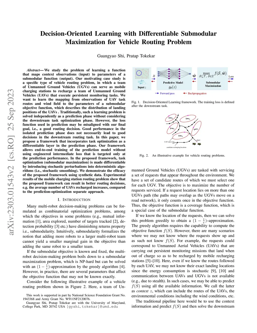 We study the problem of learning a function that maps context observations (input) to parameters of a submodular function (output). Our motivating case study is a specific type of vehicle routing problem, in which a team of Unmanned Ground Vehicles (UGVs) can serve as mobile charging stations to recharge a team of Unmanned Ground Vehicles (UAVs) that execute persistent monitoring tasks. {We want to learn the mapping from observations of UAV task routes and wind field to the parameters of a submodular objective function, which describes the distribution of landing positions of the UAVs .} Traditionally, such a learning problem is solved independently as a prediction phase without considering the downstream task optimization phase. However, the loss function used in prediction may be misaligned with our final goal, i.e., a good routing decision. Good performance in the isolated prediction phase does not necessarily lead to good decisions in the downstream routing task. In this paper, we propose a framework that incorporates task optimization as a differentiable layer in the prediction phase. Our framework allows end-to-end training of the prediction model without using engineered intermediate loss that is targeted only at the prediction performance. In the proposed framework, task optimization (submodular maximization) is made differentiable by introducing stochastic perturbations into deterministic algorithms (i.e., stochastic smoothing). We demonstrate the efficacy of the proposed framework using synthetic data. Experimental results of the mobile charging station routing problem show that the proposed framework can result in better routing decisions, e.g. the average number of UAVs recharged increases, compared to the prediction-optimization separate approach.