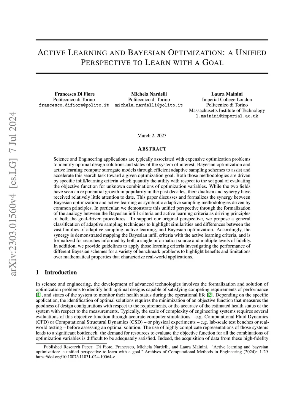 Science and Engineering applications are typically associated with expensive optimization problems to identify optimal design solutions and states of the system of interest. Bayesian optimization and active learning compute surrogate models through efficient adaptive sampling schemes to assist and accelerate this search task toward a given optimization goal. Both those methodologies are driven by specific infill/learning criteria which quantify the utility with respect to the set goal of evaluating the objective function for unknown combinations of optimization variables. While the two fields have seen an exponential growth in popularity in the past decades, their dualism and synergy have received relatively little attention to date. This paper discusses and formalizes the synergy between Bayesian optimization and active learning as symbiotic adaptive sampling methodologies driven by common principles. In particular, we demonstrate this unified perspective through the formalization of the analogy between the Bayesian infill criteria and active learning criteria as driving principles of both the goal-driven procedures. To support our original perspective, we propose a general classification of adaptive sampling techniques to highlight similarities and differences between the vast families of adaptive sampling, active learning, and Bayesian optimization. Accordingly, the synergy is demonstrated mapping the Bayesian infill criteria with the active learning criteria, and is formalized for searches informed by both a single information source and multiple levels of fidelity. In addition, we provide guidelines to apply those learning criteria investigating the performance of different Bayesian schemes for a variety of benchmark problems to highlight benefits and limitations over mathematical properties that characterize real-world applications.