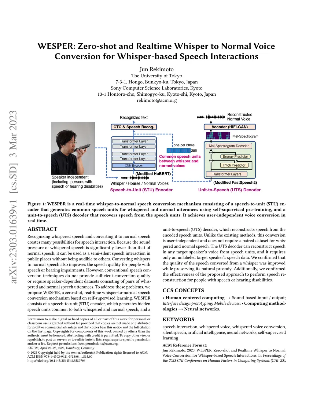 Recognizing whispered speech and converting it to normal speech creates many possibilities for speech interaction. Because the sound pressure of whispered speech is significantly lower than that of normal speech, it can be used as a semi-silent speech interaction in public places without being audible to others. Converting whispers to normal speech also improves the speech quality for people with speech or hearing impairments. However, conventional speech conversion techniques do not provide sufficient conversion quality or require speaker-dependent datasets consisting of pairs of whispered and normal speech utterances. To address these problems, we propose WESPER, a zero-shot, real-time whisper-to-normal speech conversion mechanism based on self-supervised learning. WESPER consists of a speech-to-unit (STU) encoder, which generates hidden speech units common to both whispered and normal speech, and a unit-to-speech (UTS) decoder, which reconstructs speech from the encoded speech units. Unlike the existing methods, this conversion is user-independent and does not require a paired dataset for whispered and normal speech. The UTS decoder can reconstruct speech in any target speaker's voice from speech units, and it requires only an unlabeled target speaker's speech data. We confirmed that the quality of the speech converted from a whisper was improved while preserving its natural prosody. Additionally, we confirmed the effectiveness of the proposed approach to perform speech reconstruction for people with speech or hearing disabilities. (project page: http://lab.rekimoto.org/projects/wesper )