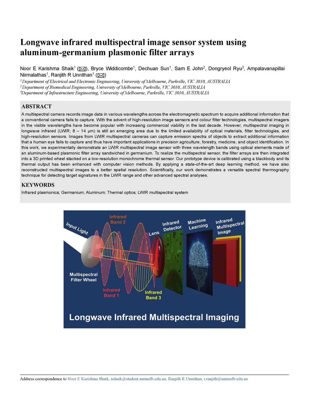 A multispectral camera records image data in various wavelengths across the electromagnetic spectrum to acquire additional information that a conventional camera fails to capture. With the advent of high-resolution image sensors and colour filter technologies, multispectral imagers in the visible wavelengths have become popular with increasing commercial viability in the last decade. However, multispectral imaging in longwave infrared (LWIR: 8 to 14 microns) is still an emerging area due to the limited availability of optical materials, filter technologies, and high-resolution sensors. Images from LWIR multispectral cameras can capture emission spectra of objects to extract additional information that a human eye fails to capture and thus have important applications in precision agriculture, forestry, medicine, and object identification. In this work, we experimentally demonstrate an LWIR multispectral image sensor with three wavelength bands using optical elements made of an aluminum-based plasmonic filter array sandwiched in germanium. To realize the multispectral sensor, the filter arrays are then integrated into a 3D printed wheel stacked on a low-resolution monochrome thermal sensor. Our prototype device is calibrated using a blackbody and its thermal output has been enhanced with computer vision methods. By applying a state-of-the-art deep learning method, we have also reconstructed multispectral images to a better spatial resolution. Scientifically, our work demonstrates a versatile spectral thermography technique for detecting target signatures in the LWIR range and other advanced spectral analyses.