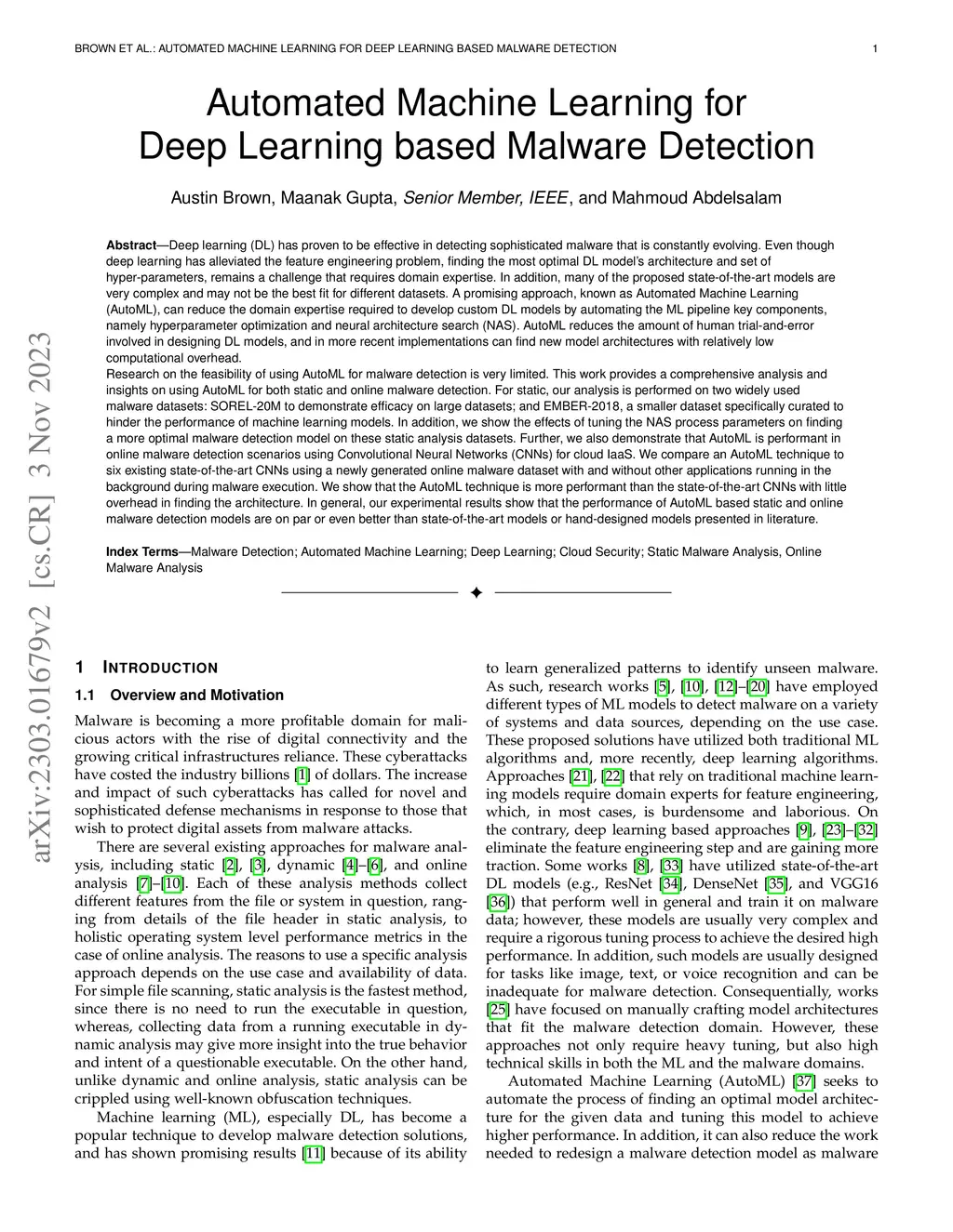 Deep learning (DL) has proven to be effective in detecting sophisticated malware that is constantly evolving. Even though deep learning has alleviated the feature engineering problem, finding the most optimal DL model, in terms of neural architecture search (NAS) and the model's optimal set of hyper-parameters, remains a challenge that requires domain expertise. In addition, many of the proposed state-of-the-art models are very complex and may not be the best fit for different datasets. A promising approach, known as Automated Machine Learning (AutoML), can reduce the domain expertise required to implement a custom DL model. AutoML reduces the amount of human trial-and-error involved in designing DL models, and in more recent implementations can find new model architectures with relatively low computational overhead. This work provides a comprehensive analysis and insights on using AutoML for static and online malware detection. For static, our analysis is performed on two widely used malware datasets: SOREL-20M to demonstrate efficacy on large datasets; and EMBER-2018, a smaller dataset specifically curated to hinder the performance of machine learning models. In addition, we show the effects of tuning the NAS process parameters on finding a more optimal malware detection model on these static analysis datasets. Further, we also demonstrate that AutoML is performant in online malware detection scenarios using Convolutional Neural Networks (CNNs) for cloud IaaS. We compare an AutoML technique to six existing state-of-the-art CNNs using a newly generated online malware dataset with and without other applications running in the background during malware execution.In general, our experimental results show that the performance of AutoML based static and online malware detection models are on par or even better than state-of-the-art models or hand-designed models presented in literature.