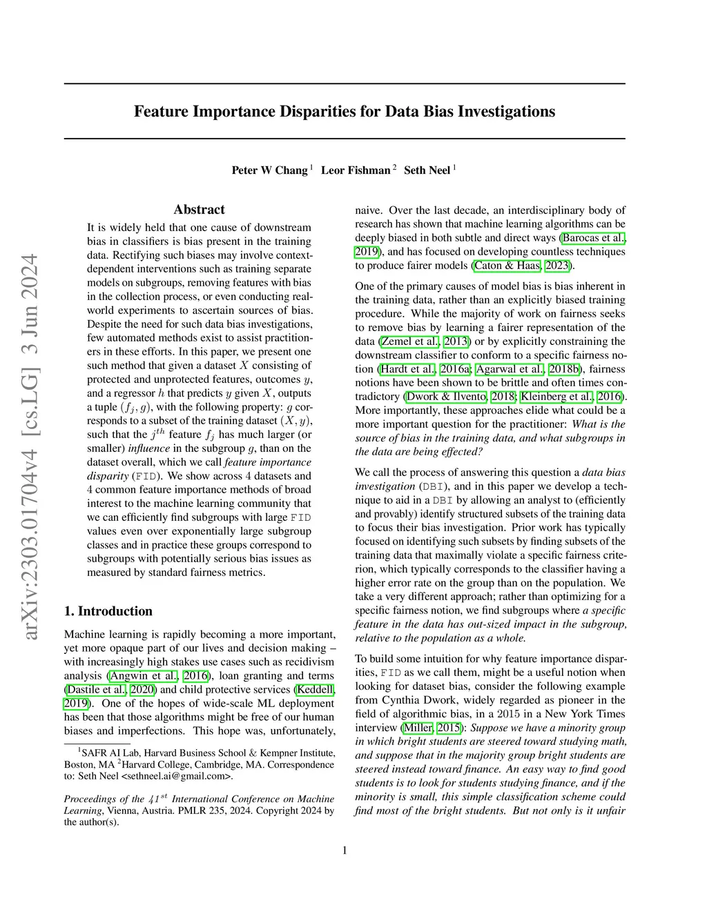 It is widely held that one cause of downstream bias in classifiers is bias present in the training data. Rectifying such biases may involve context-dependent interventions such as training separate models on subgroups, removing features with bias in the collection process, or even conducting real-world experiments to ascertain sources of bias. Despite the need for such data bias investigations, few automated methods exist to assist practitioners in these efforts. In this paper, we present one such method that given a dataset consisting of protected and unprotected features, outcomes , and a regressor that predicts given , outputs a tuple , with the following property: corresponds to a subset of the training dataset , such that the feature has much larger (or smaller) influence in the subgroup , than on the dataset overall, which we call feature importance disparity (FID). We show across datasets and common feature importance methods of broad interest to the machine learning community that we can efficiently find subgroups with large FID values even over exponentially large subgroup classes and in practice these groups correspond to subgroups with potentially serious bias issues as measured by standard fairness metrics.