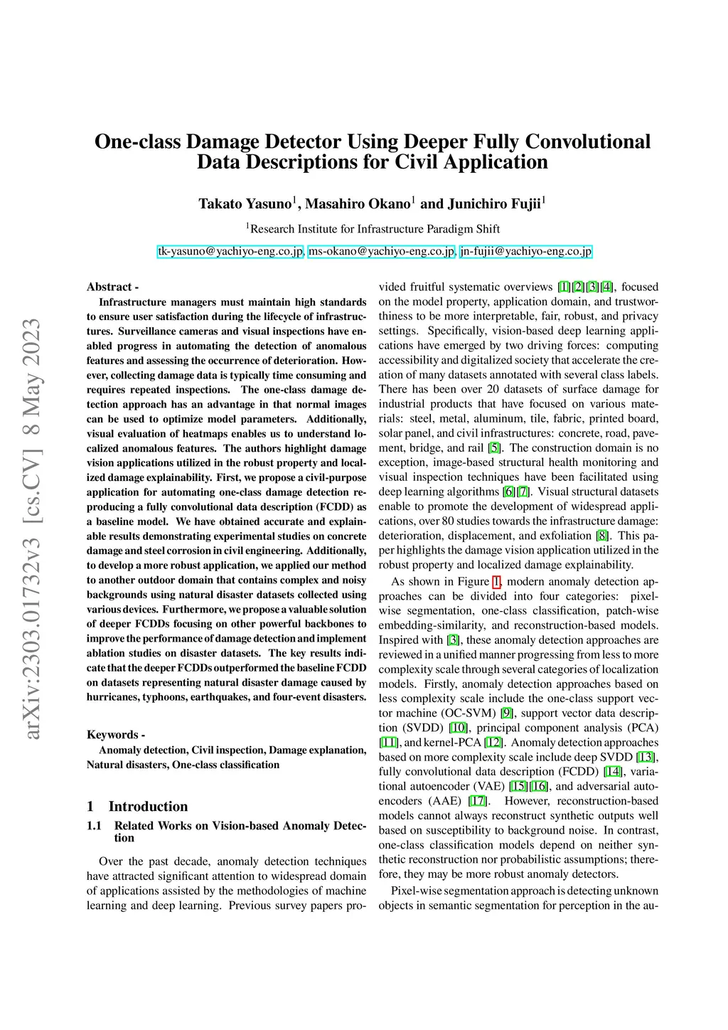 Infrastructure managers must maintain high standards to ensure user satisfaction during the lifecycle of infrastructures. Surveillance cameras and visual inspections have enabled progress in automating the detection of anomalous features and assessing the occurrence of deterioration. However, collecting damage data is typically time consuming and requires repeated inspections. The one-class damage detection approach has an advantage in that normal images can be used to optimize model parameters. Additionally, visual evaluation of heatmaps enables us to understand localized anomalous features. The authors highlight damage vision applications utilized in the robust property and localized damage explainability. First, we propose a civil-purpose application for automating one-class damage detection reproducing a fully convolutional data description (FCDD) as a baseline model. We have obtained accurate and explainable results demonstrating experimental studies on concrete damage and steel corrosion in civil engineering. Additionally, to develop a more robust application, we applied our method to another outdoor domain that contains complex and noisy backgrounds using natural disaster datasets collected using various devices. Furthermore, we propose a valuable solution of deeper FCDDs focusing on other powerful backbones to improve the performance of damage detection and implement ablation studies on disaster datasets. The key results indicate that the deeper FCDDs outperformed the baseline FCDD on datasets representing natural disaster damage caused by hurricanes, typhoons, earthquakes, and four-event disasters.