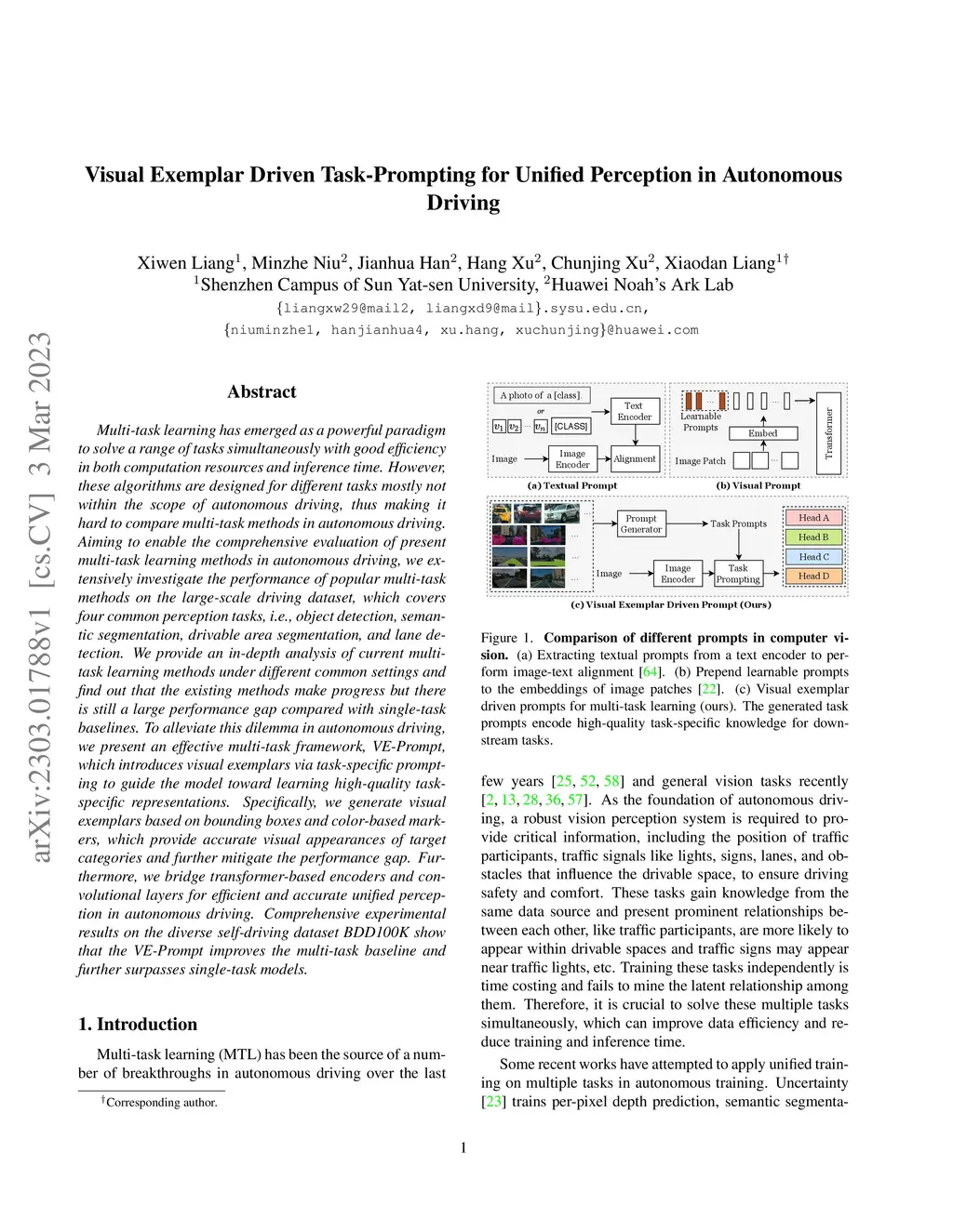 Multi-task learning has emerged as a powerful paradigm to solve a range of tasks simultaneously with good efficiency in both computation resources and inference time. However, these algorithms are designed for different tasks mostly not within the scope of autonomous driving, thus making it hard to compare multi-task methods in autonomous driving. Aiming to enable the comprehensive evaluation of present multi-task learning methods in autonomous driving, we extensively investigate the performance of popular multi-task methods on the large-scale driving dataset, which covers four common perception tasks, i.e., object detection, semantic segmentation, drivable area segmentation, and lane detection. We provide an in-depth analysis of current multi-task learning methods under different common settings and find out that the existing methods make progress but there is still a large performance gap compared with single-task baselines. To alleviate this dilemma in autonomous driving, we present an effective multi-task framework, VE-Prompt, which introduces visual exemplars via task-specific prompting to guide the model toward learning high-quality task-specific representations. Specifically, we generate visual exemplars based on bounding boxes and color-based markers, which provide accurate visual appearances of target categories and further mitigate the performance gap. Furthermore, we bridge transformer-based encoders and convolutional layers for efficient and accurate unified perception in autonomous driving. Comprehensive experimental results on the diverse self-driving dataset BDD100K show that the VE-Prompt improves the multi-task baseline and further surpasses single-task models.