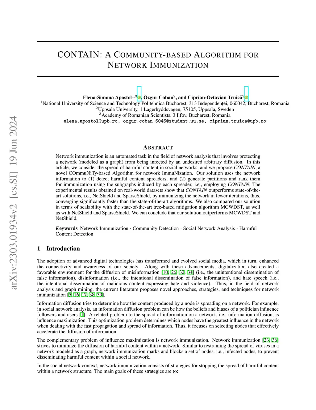 Within the network analysis field, network immunization refers to the task of protecting a network from some arbitrary diffusion that tries to infect it. In this article, we consider the spread of harmful content in social networks, and we propose CONTAIN, a novel COmmuNiTy-based Algorithm for network ImmuNization. Our solution uses the network information to (1) detect harmful content spreaders, and (2) generate partitions and rank them for immunization using the subgraphs induced by each spreader, i.e., employing CONTAIN. The experimental results obtained on real-world datasets show that CONTAIN outperforms state-of-the-art solutions, i.e., NetShield and SparseShield, by immunizing the network in fewer iterations, thus, converging significantly faster than the state-of-the-art algorithms.