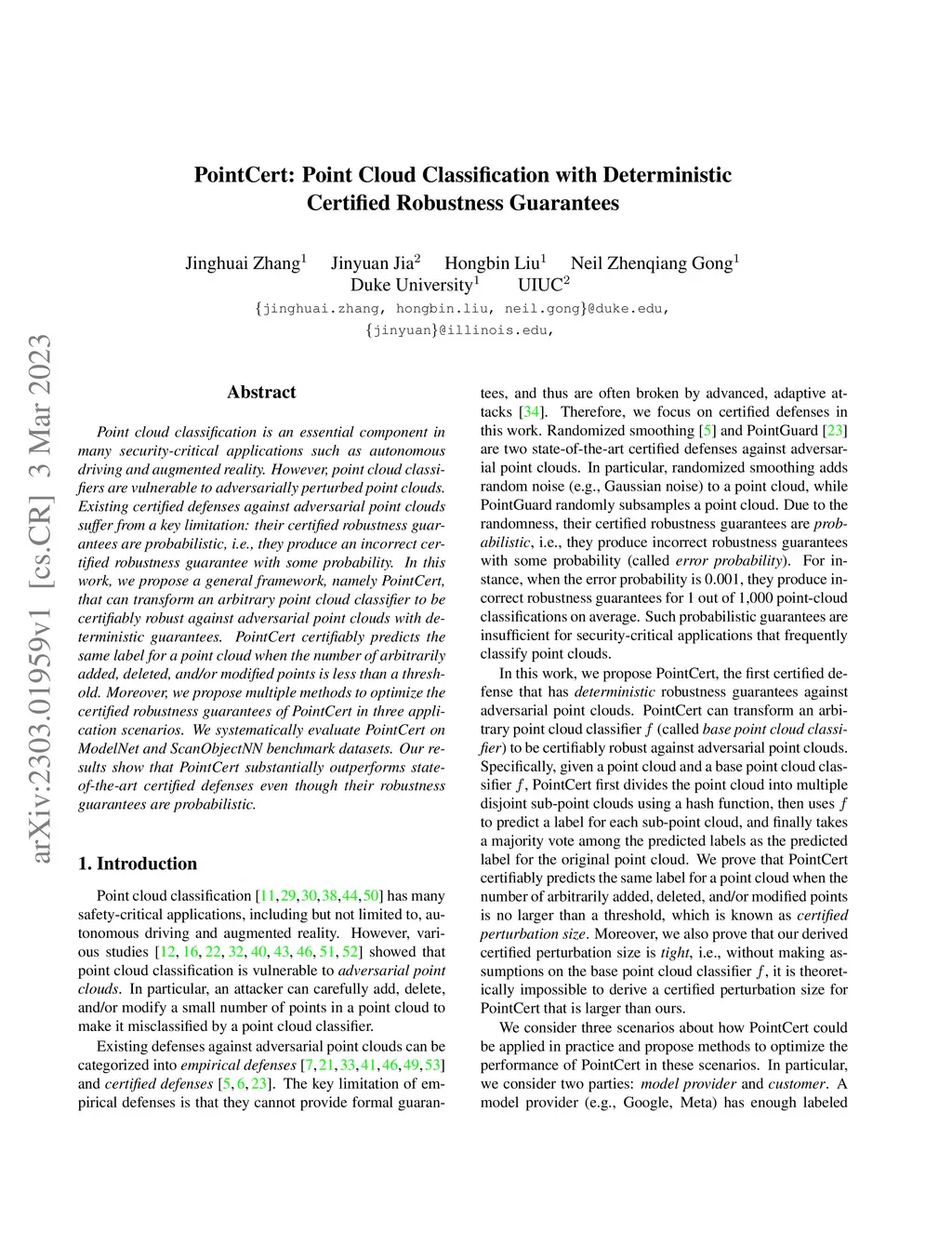 PointCert: Point Cloud Classification with Deterministic Certified
