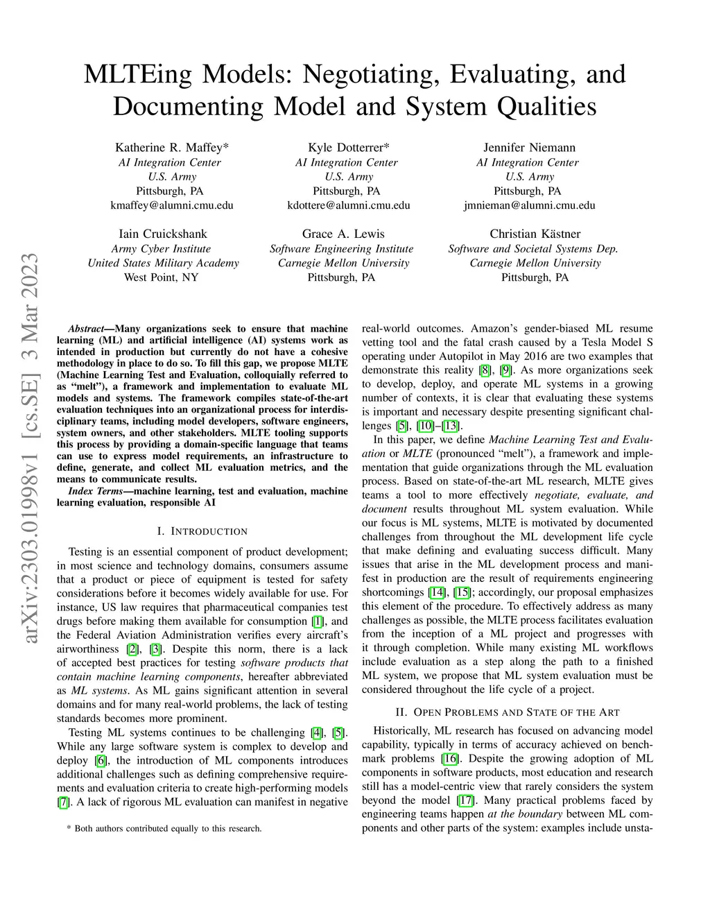 Many organizations seek to ensure that machine learning (ML) and artificial intelligence (AI) systems work as intended in production but currently do not have a cohesive methodology in place to do so. To fill this gap, we propose MLTE (Machine Learning Test and Evaluation, colloquially referred to as "melt"), a framework and implementation to evaluate ML models and systems. The framework compiles state-of-the-art evaluation techniques into an organizational process for interdisciplinary teams, including model developers, software engineers, system owners, and other stakeholders. MLTE tooling supports this process by providing a domain-specific language that teams can use to express model requirements, an infrastructure to define, generate, and collect ML evaluation metrics, and the means to communicate results.