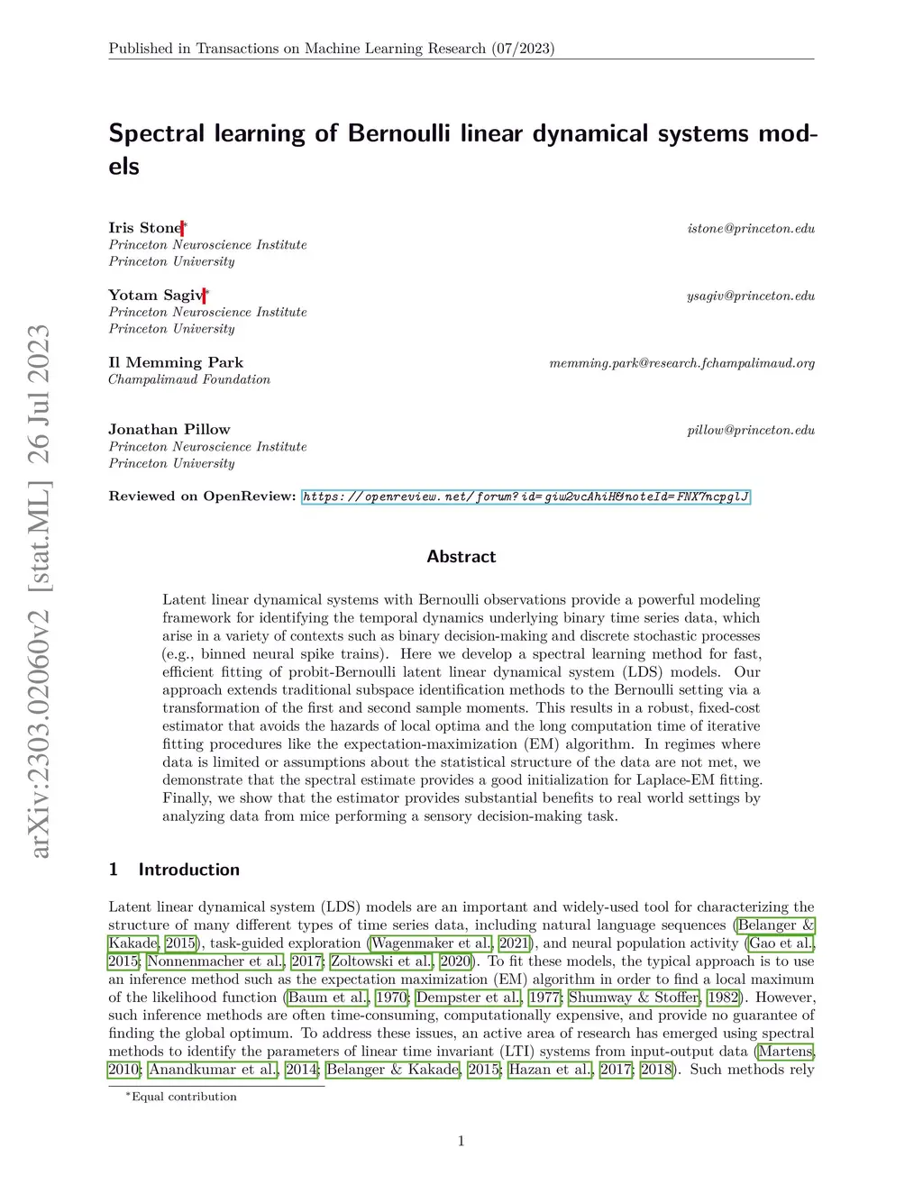 Spectral learning of Bernoulli linear dynamical systems models