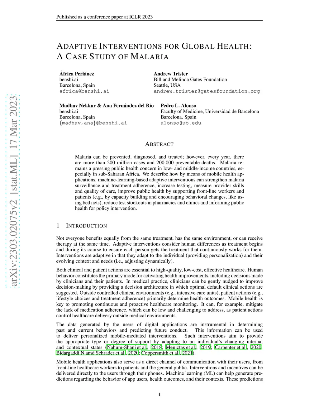 Malaria can be prevented, diagnosed, and treated; however, every year, there are more than 200 million cases and 200.000 preventable deaths. Malaria remains a pressing public health concern in low- and middle-income countries, especially in sub-Saharan Africa. We describe how by means of mobile health applications, machine-learning-based adaptive interventions can strengthen malaria surveillance and treatment adherence, increase testing, measure provider skills and quality of care, improve public health by supporting front-line workers and patients (e.g., by capacity building and encouraging behavioral changes, like using bed nets), reduce test stockouts in pharmacies and clinics and informing public health for policy intervention.