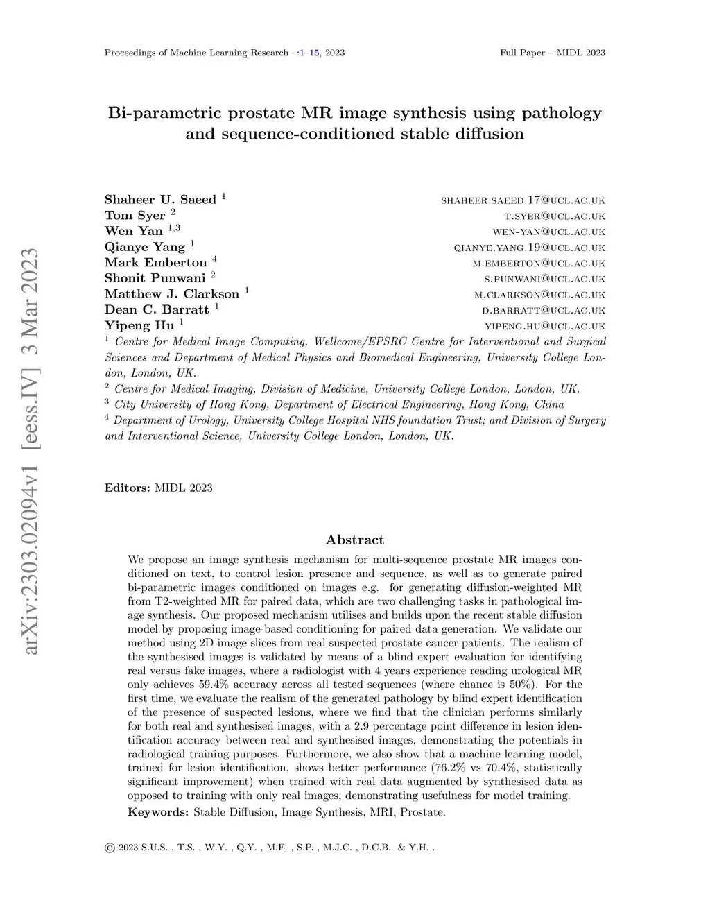 We propose an image synthesis mechanism for multi-sequence prostate MR images conditioned on text, to control lesion presence and sequence, as well as to generate paired bi-parametric images conditioned on images e.g. for generating diffusion-weighted MR from T2-weighted MR for paired data, which are two challenging tasks in pathological image synthesis. Our proposed mechanism utilises and builds upon the recent stable diffusion model by proposing image-based conditioning for paired data generation. We validate our method using 2D image slices from real suspected prostate cancer patients. The realism of the synthesised images is validated by means of a blind expert evaluation for identifying real versus fake images, where a radiologist with 4 years experience reading urological MR only achieves 59.4% accuracy across all tested sequences (where chance is 50%). For the first time, we evaluate the realism of the generated pathology by blind expert identification of the presence of suspected lesions, where we find that the clinician performs similarly for both real and synthesised images, with a 2.9 percentage point difference in lesion identification accuracy between real and synthesised images, demonstrating the potentials in radiological training purposes. Furthermore, we also show that a machine learning model, trained for lesion identification, shows better performance (76.2% vs 70.4%, statistically significant improvement) when trained with real data augmented by synthesised data as opposed to training with only real images, demonstrating usefulness for model training.