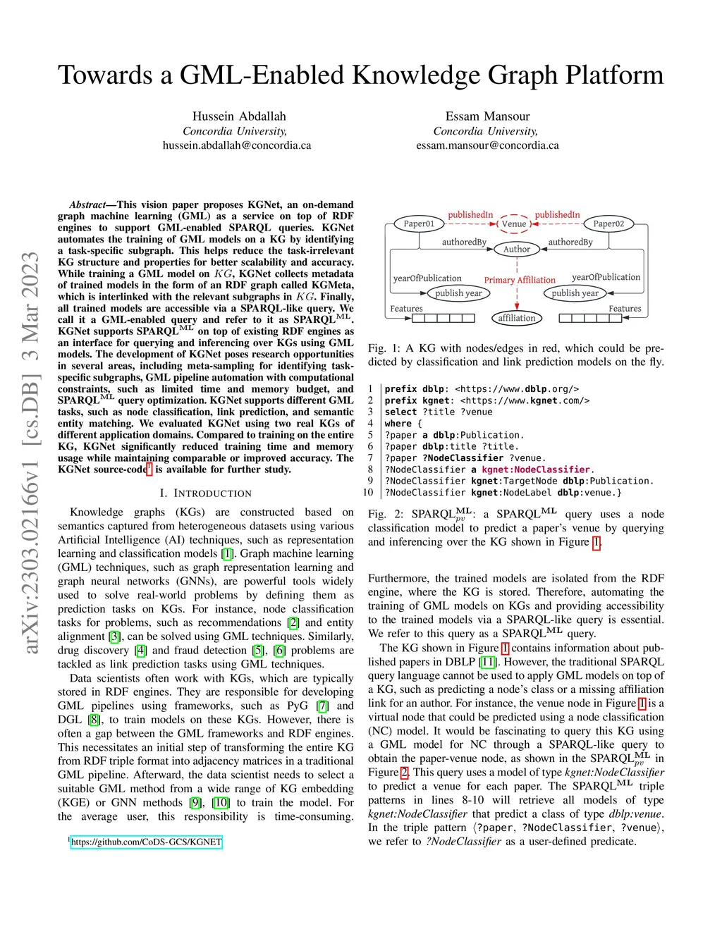 This vision paper proposes KGNet, an on-demand graph machine learning (GML) as a service on top of RDF engines to support GML-enabled SPARQL queries. KGNet automates the training of GML models on a KG by identifying a task-specific subgraph. This helps reduce the task-irrelevant KG structure and properties for better scalability and accuracy. While training a GML model on KG, KGNet collects metadata of trained models in the form of an RDF graph called KGMeta, which is interlinked with the relevant subgraphs in KG. Finally, all trained models are accessible via a SPARQL-like query. We call it a GML-enabled query and refer to it as SPARQLML. KGNet supports SPARQLML on top of existing RDF engines as an interface for querying and inferencing over KGs using GML models. The development of KGNet poses research opportunities in several areas, including meta-sampling for identifying task-specific subgraphs, GML pipeline automation with computational constraints, such as limited time and memory budget, and SPARQLML query optimization. KGNet supports different GML tasks, such as node classification, link prediction, and semantic entity matching. We evaluated KGNet using two real KGs of different application domains. Compared to training on the entire KG, KGNet significantly reduced training time and memory usage while maintaining comparable or improved accuracy. The KGNet source-code is available for further study