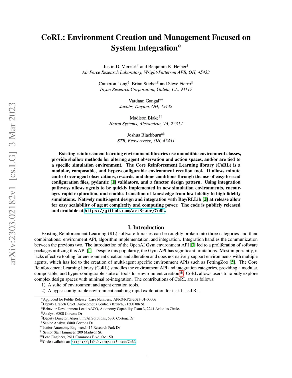 Existing reinforcement learning environment libraries use monolithic environment classes, provide shallow methods for altering agent observation and action spaces, and/or are tied to a specific simulation environment. The Core Reinforcement Learning library (CoRL) is a modular, composable, and hyper-configurable environment creation tool. It allows minute control over agent observations, rewards, and done conditions through the use of easy-to-read configuration files, pydantic validators, and a functor design pattern. Using integration pathways allows agents to be quickly implemented in new simulation environments, encourages rapid exploration, and enables transition of knowledge from low-fidelity to high-fidelity simulations. Natively multi-agent design and integration with Ray/RLLib (Liang et al., 2018) at release allow for easy scalability of agent complexity and computing power. The code is publicly released and available at https://github.com/act3-ace/CoRL.