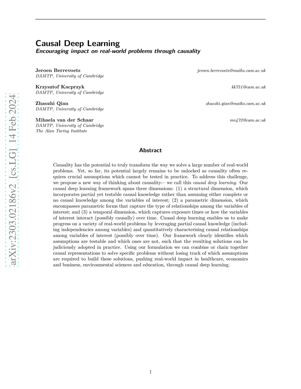 Causality has the potential to truly transform the way we solve a large number of real-world problems. Yet, so far, its potential largely remains to be unlocked as causality often requires crucial assumptions which cannot be tested in practice. To address this challenge, we propose a new way of thinking about causality -- we call this causal deep learning. Our causal deep learning framework spans three dimensions: (1) a structural dimension, which incorporates partial yet testable causal knowledge rather than assuming either complete or no causal knowledge among the variables of interest; (2) a parametric dimension, which encompasses parametric forms that capture the type of relationships among the variables of interest; and (3) a temporal dimension, which captures exposure times or how the variables of interest interact (possibly causally) over time. Causal deep learning enables us to make progress on a variety of real-world problems by leveraging partial causal knowledge (including independencies among variables) and quantitatively characterising causal relationships among variables of interest (possibly over time). Our framework clearly identifies which assumptions are testable and which ones are not, such that the resulting solutions can be judiciously adopted in practice. Using our formulation we can combine or chain together causal representations to solve specific problems without losing track of which assumptions are required to build these solutions, pushing real-world impact in healthcare, economics and business, environmental sciences and education, through causal deep learning.