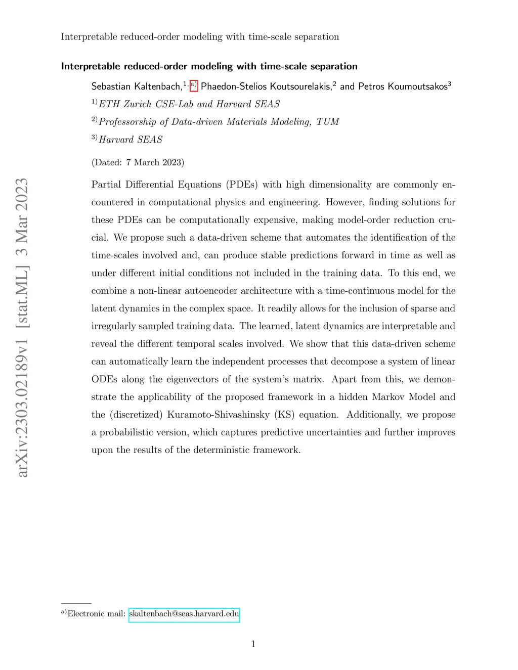 Partial Differential Equations (PDEs) with high dimensionality are commonly encountered in computational physics and engineering. However, finding solutions for these PDEs can be computationally expensive, making model-order reduction crucial. We propose such a data-driven scheme that automates the identification of the time-scales involved and can produce stable predictions forward in time as well as under different initial conditions not included in the training data. To this end, we combine a non-linear autoencoder architecture with a time-continuous model for the latent dynamics in the complex space. It readily allows for the inclusion of sparse and irregularly sampled training data. The learned, latent dynamics are interpretable and reveal the different temporal scales involved. We show that this data-driven scheme can automatically learn the independent processes that decompose a system of linear ODEs along the eigenvectors of the system's matrix. Apart from this, we demonstrate the applicability of the proposed framework in a hidden Markov Model and the (discretized) Kuramoto-Shivashinsky (KS) equation. Additionally, we propose a probabilistic version, which captures predictive uncertainties and further improves upon the results of the deterministic framework.