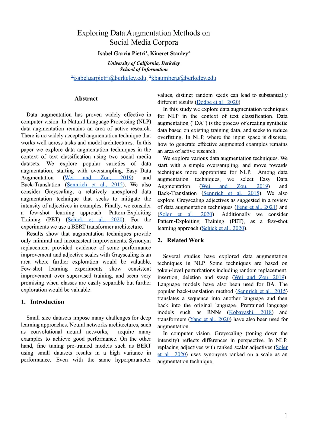 Data augmentation has proven widely effective in computer vision. In Natural Language Processing (NLP) data augmentation remains an area of active research. There is no widely accepted augmentation technique that works well across tasks and model architectures. In this paper we explore data augmentation techniques in the context of text classification using two social media datasets. We explore popular varieties of data augmentation, starting with oversampling, Easy Data Augmentation (Wei and Zou, 2019) and Back-Translation (Sennrich et al., 2015). We also consider Greyscaling, a relatively unexplored data augmentation technique that seeks to mitigate the intensity of adjectives in examples. Finally, we consider a few-shot learning approach: Pattern-Exploiting Training (PET) (Schick et al., 2020). For the experiments we use a BERT transformer architecture. Results show that augmentation techniques provide only minimal and inconsistent improvements. Synonym replacement provided evidence of some performance improvement and adjective scales with Grayscaling is an area where further exploration would be valuable. Few-shot learning experiments show consistent improvement over supervised training, and seem very promising when classes are easily separable but further exploration would be valuable.