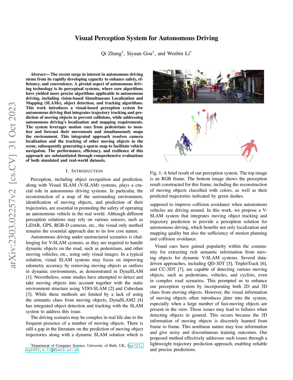 The recent surge in interest in autonomous driving stems from its rapidly developing capacity to enhance safety, efficiency, and convenience. A pivotal aspect of autonomous driving technology is its perceptual systems, where core algorithms have yielded more precise algorithms applicable to autonomous driving, including vision-based Simultaneous Localization and Mapping (SLAMs), object detection, and tracking algorithms. This work introduces a visual-based perception system for autonomous driving that integrates trajectory tracking and prediction of moving objects to prevent collisions, while addressing autonomous driving's localization and mapping requirements. The system leverages motion cues from pedestrians to monitor and forecast their movements and simultaneously maps the environment. This integrated approach resolves camera localization and the tracking of other moving objects in the scene, subsequently generating a sparse map to facilitate vehicle navigation. The performance, efficiency, and resilience of this approach are substantiated through comprehensive evaluations of both simulated and real-world datasets.