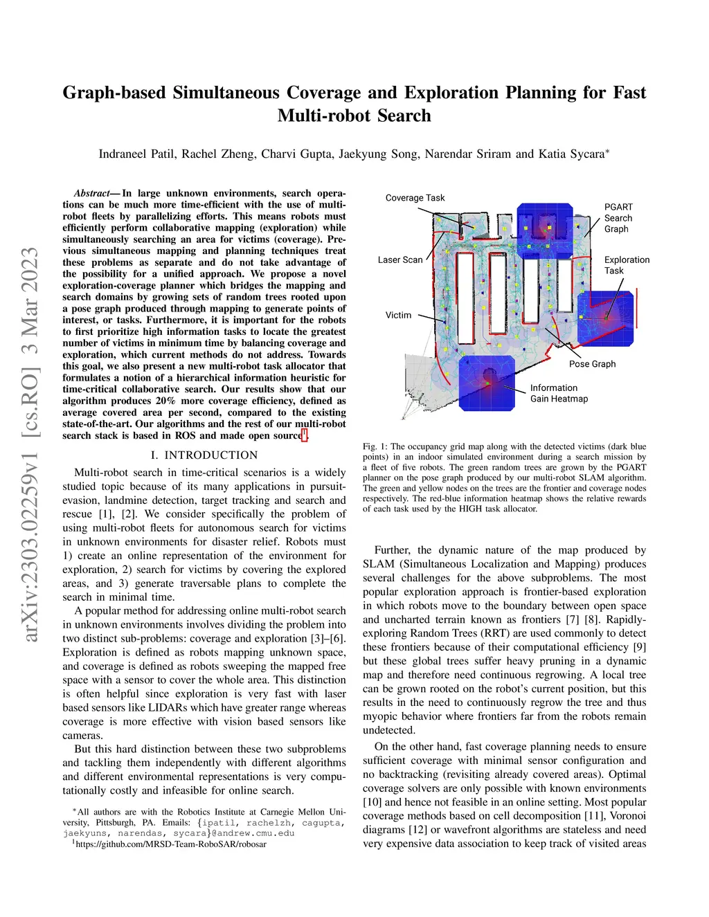 In large unknown environments, search operations can be much more time-efficient with the use of multi-robot fleets by parallelizing efforts. This means robots must efficiently perform collaborative mapping (exploration) while simultaneously searching an area for victims (coverage). Previous simultaneous mapping and planning techniques treat these problems as separate and do not take advantage of the possibility for a unified approach. We propose a novel exploration-coverage planner which bridges the mapping and search domains by growing sets of random trees rooted upon a pose graph produced through mapping to generate points of interest, or tasks. Furthermore, it is important for the robots to first prioritize high information tasks to locate the greatest number of victims in minimum time by balancing coverage and exploration, which current methods do not address. Towards this goal, we also present a new multi-robot task allocator that formulates a notion of a hierarchical information heuristic for time-critical collaborative search. Our results show that our algorithm produces 20% more coverage efficiency, defined as average covered area per second, compared to the existing state-of-the-art. Our algorithms and the rest of our multi-robot search stack is based in ROS and made open source
