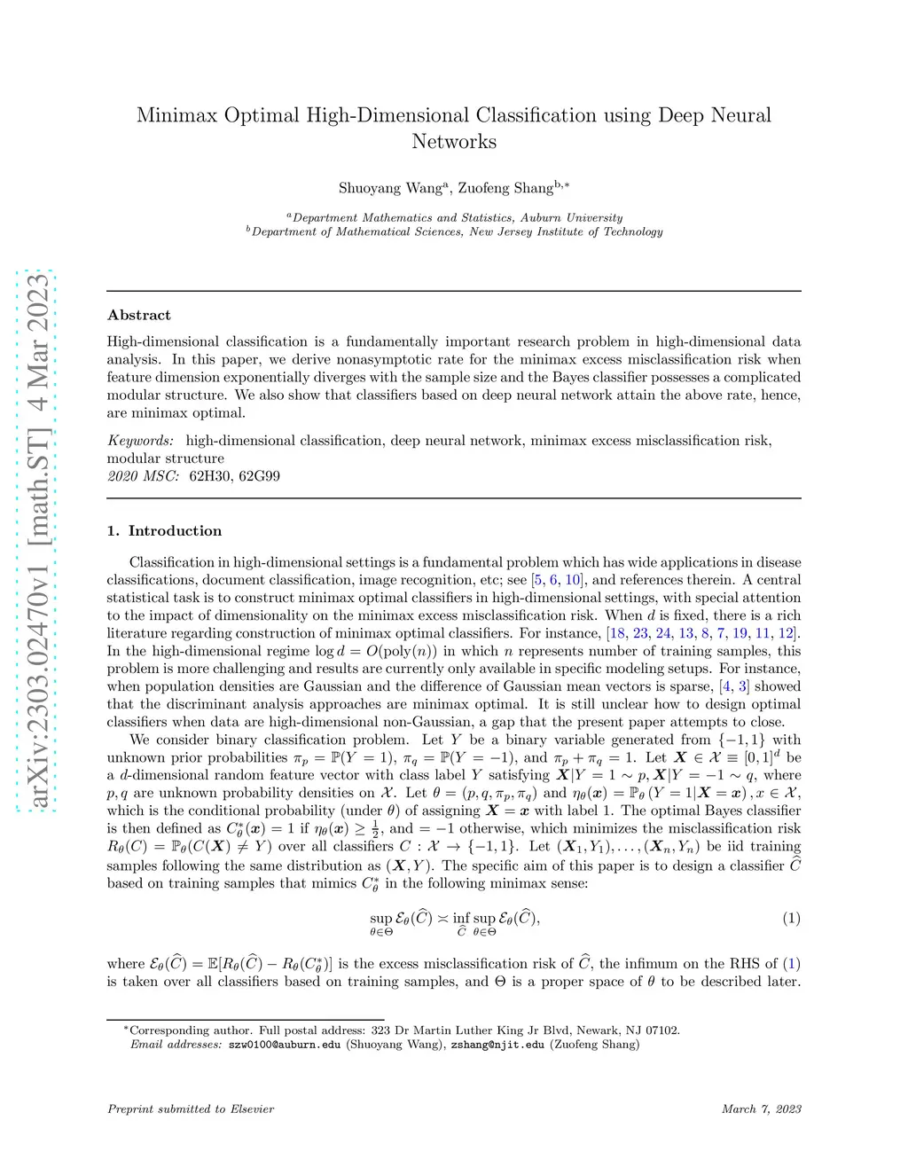 High-dimensional classification is a fundamentally important research problem in high-dimensional data analysis. In this paper, we derive a nonasymptotic rate for the minimax excess misclassification risk when feature dimension exponentially diverges with the sample size and the Bayes classifier possesses a complicated modular structure. We also show that classifiers based on deep neural networks can attain the above rate, hence, are minimax optimal.