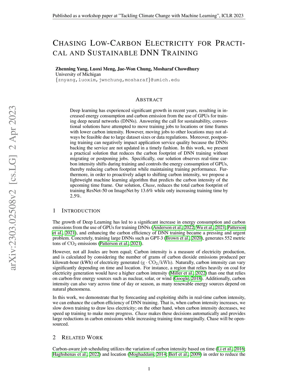 Deep learning has experienced significant growth in recent years, resulting in increased energy consumption and carbon emission from the use of GPUs for training deep neural networks (DNNs). Answering the call for sustainability, conventional solutions have attempted to move training jobs to locations or time frames with lower carbon intensity. However, moving jobs to other locations may not always be feasible due to large dataset sizes or data regulations. Moreover, postponing training can negatively impact application service quality because the DNNs backing the service are not updated in a timely fashion. In this work, we present a practical solution that reduces the carbon footprint of DNN training without migrating or postponing jobs. Specifically, our solution observes real-time carbon intensity shifts during training and controls the energy consumption of GPUs, thereby reducing carbon footprint while maintaining training performance. Furthermore, in order to proactively adapt to shifting carbon intensity, we propose a lightweight machine learning algorithm that predicts the carbon intensity of the upcoming time frame. Our solution, Chase, reduces the total carbon footprint of training ResNet-50 on ImageNet by 13.6% while only increasing training time by 2.5%.