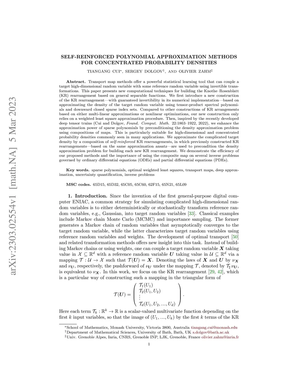 Transport map methods offer a powerful statistical learning tool that can couple a target high-dimensional random variable with some reference random variable using invertible transformations. This paper presents new computational techniques for building the Knothe--Rosenblatt (KR) rearrangement based on general separable functions. We first introduce a new construction of the KR rearrangement -- with guaranteed invertibility in its numerical implementation -- based on approximating the density of the target random variable using tensor-product spectral polynomials and downward closed sparse index sets. Compared to other constructions of KR arrangements based on either multi-linear approximations or nonlinear optimizations, our new construction only relies on a weighted least square approximation procedure. Then, inspired by the recently developed deep tensor trains (Cui and Dolgov, Found. Comput. Math. 22:1863--1922, 2022), we enhance the approximation power of sparse polynomials by preconditioning the density approximation problem using compositions of maps. This is particularly suitable for high-dimensional and concentrated probability densities commonly seen in many applications. We approximate the complicated target density by a composition of self-reinforced KR rearrangements, in which previously constructed KR rearrangements -- based on the same approximation ansatz -- are used to precondition the density approximation problem for building each new KR rearrangement. We demonstrate the efficiency of our proposed methods and the importance of using the composite map on several inverse problems governed by ordinary differential equations (ODEs) and partial differential equations (PDEs).