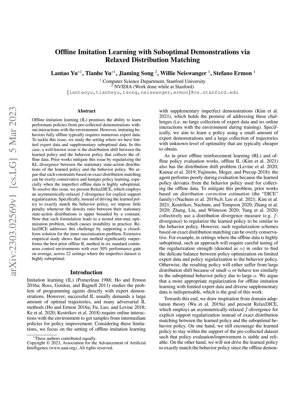 Offline imitation learning (IL) promises the ability to learn performant policies from pre-collected demonstrations without interactions with the environment. However, imitating behaviors fully offline typically requires numerous expert data. To tackle this issue, we study the setting where we have limited expert data and supplementary suboptimal data. In this case, a well-known issue is the distribution shift between the learned policy and the behavior policy that collects the offline data. Prior works mitigate this issue by regularizing the KL divergence between the stationary state-action distributions of the learned policy and the behavior policy. We argue that such constraints based on exact distribution matching can be overly conservative and hamper policy learning, especially when the imperfect offline data is highly suboptimal. To resolve this issue, we present RelaxDICE, which employs an asymmetrically-relaxed f-divergence for explicit support regularization. Specifically, instead of driving the learned policy to exactly match the behavior policy, we impose little penalty whenever the density ratio between their stationary state-action distributions is upper bounded by a constant. Note that such formulation leads to a nested min-max optimization problem, which causes instability in practice. RelaxDICE addresses this challenge by supporting a closed-form solution for the inner maximization problem. Extensive empirical study shows that our method significantly outperforms the best prior offline IL method in six standard continuous control environments with over 30% performance gain on average, across 22 settings where the imperfect dataset is highly suboptimal.