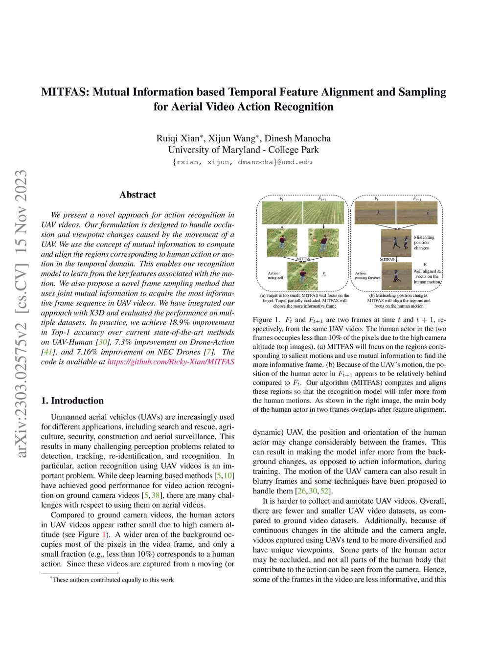 We present a novel approach for action recognition in UAV videos. Our formulation is designed to handle occlusion and viewpoint changes caused by the movement of a UAV. We use the concept of mutual information to compute and align the regions corresponding to human action or motion in the temporal domain. This enables our recognition model to learn from the key features associated with the motion. We also propose a novel frame sampling method that uses joint mutual information to acquire the most informative frame sequence in UAV videos. We have integrated our approach with X3D and evaluated the performance on multiple datasets. In practice, we achieve 18.9% improvement in Top-1 accuracy over current state-of-the-art methods on UAV-Human(Li et al., 2021), 7.3% improvement on Drone-Action(Perera et al., 2019), and 7.16% improvement on NEC Drones(Choi et al., 2020).