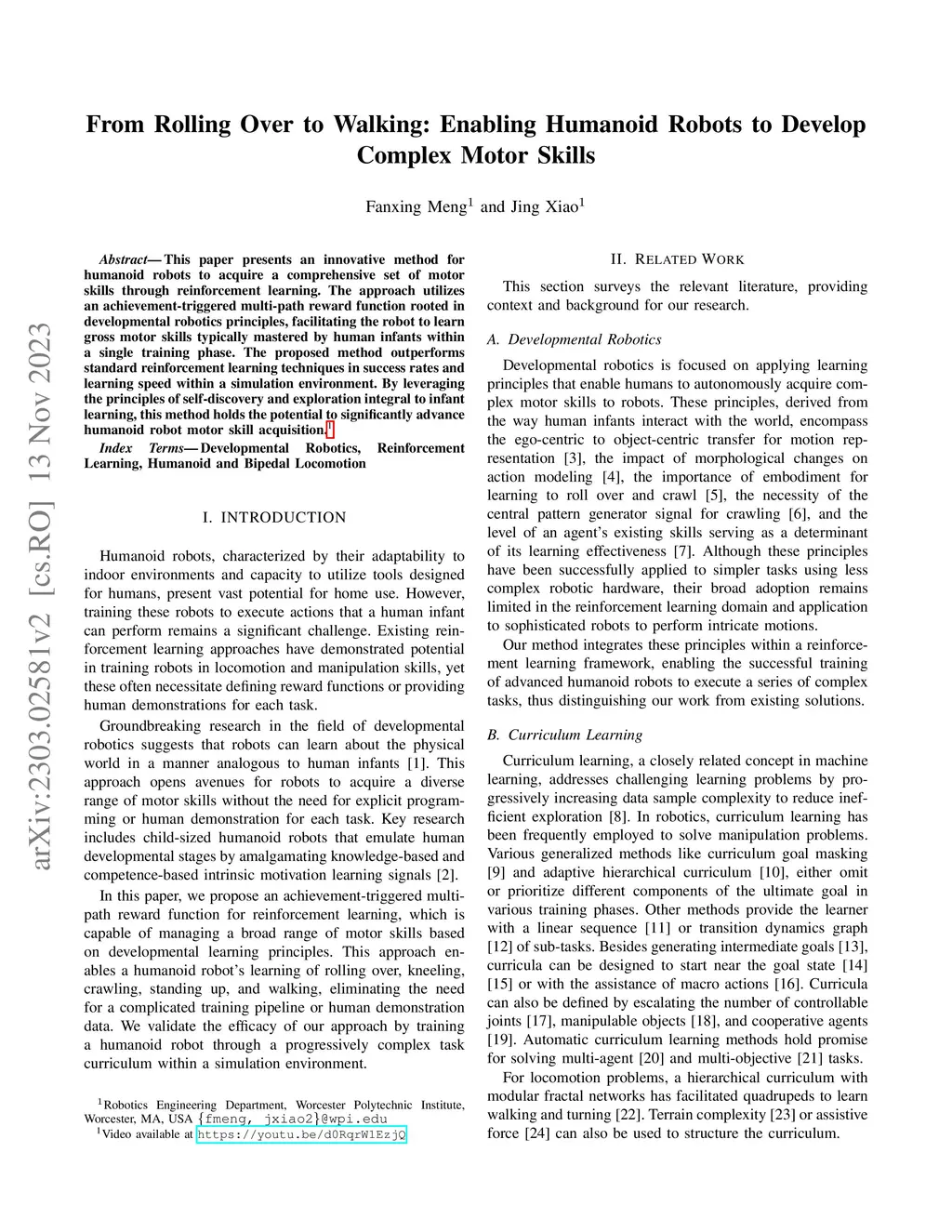 This paper presents an innovative method for humanoid robots to acquire a comprehensive set of motor skills through reinforcement learning. The approach utilizes an achievement-triggered multi-path reward function rooted in developmental robotics principles, facilitating the robot to learn gross motor skills typically mastered by human infants within a single training phase. The proposed method outperforms standard reinforcement learning techniques in success rates and learning speed within a simulation environment. By leveraging the principles of self-discovery and exploration integral to infant learning, this method holds the potential to significantly advance humanoid robot motor skill acquisition.