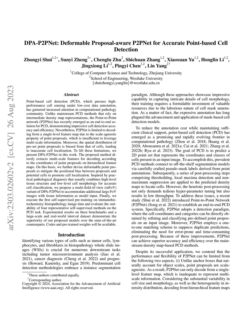 Point-based cell detection (PCD), which pursues high-performance cell sensing under low-cost data annotation, has garnered increased attention in computational pathology community. Unlike mainstream PCD methods that rely on intermediate density map representations, the Point-to-Point network (P2PNet) has recently emerged as an end-to-end solution for PCD, demonstrating impressive cell detection accuracy and efficiency. Nevertheless, P2PNet is limited to decoding from a single-level feature map due to the scale-agnostic property of point proposals, which is insufficient to leverage multi-scale information. Moreover, the spatial distribution of pre-set point proposals is biased from that of cells, leading to inaccurate cell localization. To lift these limitations, we present DPA-P2PNet in this work. The proposed method directly extracts multi-scale features for decoding according to the coordinates of point proposals on hierarchical feature maps. On this basis, we further devise deformable point proposals to mitigate the positional bias between proposals and potential cells to promote cell localization. Inspired by practical pathological diagnosis that usually combines high-level tissue structure and low-level cell morphology for accurate cell classification, we propose a multi-field-of-view (mFoV) variant of DPA-P2PNet to accommodate additional large FoV images with tissue information as model input. Finally, we execute the first self-supervised pre-training on immunohistochemistry histopathology image data and evaluate the suitability of four representative self-supervised methods on the PCD task. Experimental results on three benchmarks and a large-scale and real-world interval dataset demonstrate the superiority of our proposed models over the state-of-the-art counterparts. Codes and pre-trained weights will be available.