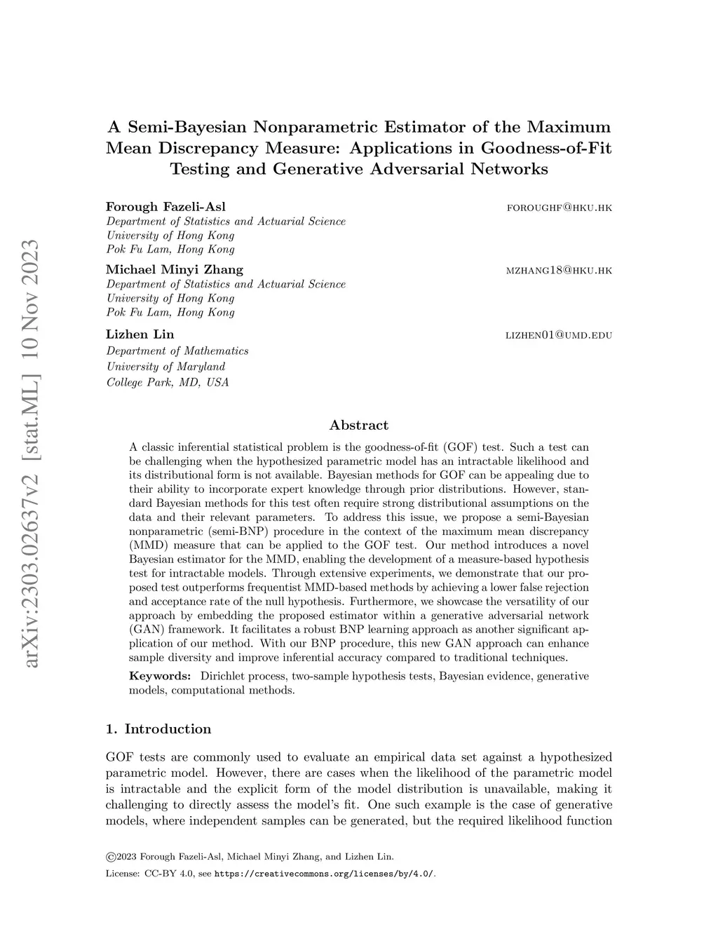 A classic inferential statistical problem is the goodness-of-fit (GOF) test. Such a test can be challenging when the hypothesized parametric model has an intractable likelihood and its distributional form is not available. Bayesian methods for GOF can be appealing due to their ability to incorporate expert knowledge through prior distributions. However, standard Bayesian methods for this test often require strong distributional assumptions on the data and their relevant parameters. To address this issue, we propose a semi-Bayesian nonparametric (semi-BNP) procedure in the context of the maximum mean discrepancy (MMD) measure that can be applied to the GOF test. Our method introduces a novel Bayesian estimator for the MMD, enabling the development of a measure-based hypothesis test for intractable models. Through extensive experiments, we demonstrate that our proposed test outperforms frequentist MMD-based methods by achieving a lower false rejection and acceptance rate of the null hypothesis. Furthermore, we showcase the versatility of our approach by embedding the proposed estimator within a generative adversarial network (GAN) framework. It facilitates a robust BNP learning approach as another significant application of our method. With our BNP procedure, this new GAN approach can enhance sample diversity and improve inferential accuracy compared to traditional techniques.