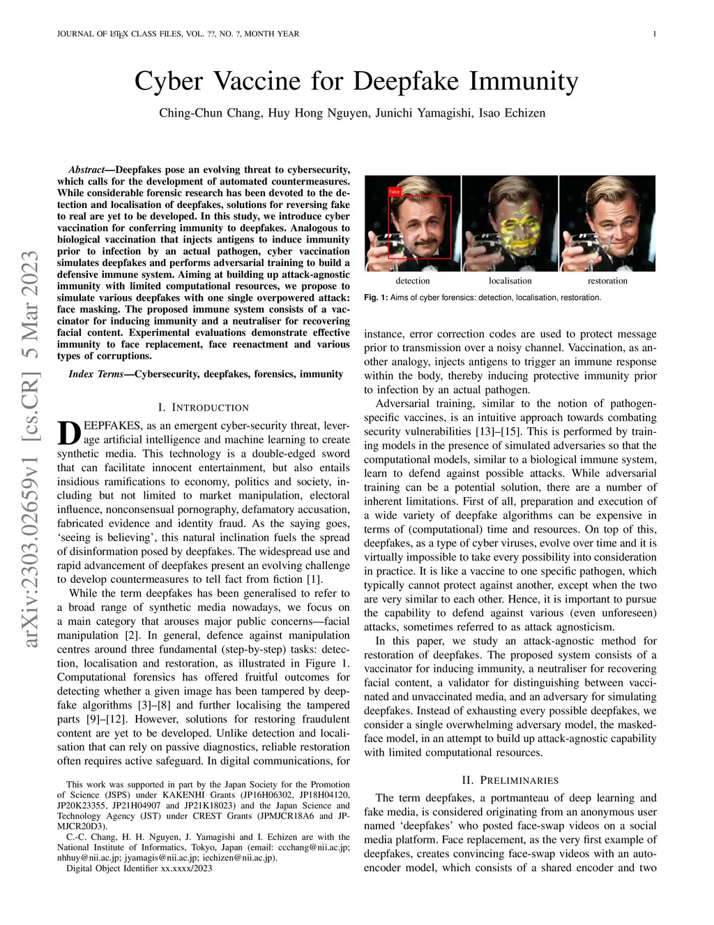 Deepfakes pose an evolving threat to cybersecurity, which calls for the development of automated countermeasures. While considerable forensic research has been devoted to the detection and localisation of deepfakes, solutions for reversing fake to real are yet to be developed. In this study, we introduce cyber vaccination for conferring immunity to deepfakes. Analogous to biological vaccination that injects antigens to induce immunity prior to infection by an actual pathogen, cyber vaccination simulates deepfakes and performs adversarial training to build a defensive immune system. Aiming at building up attack-agnostic immunity with limited computational resources, we propose to simulate various deepfakes with one single overpowered attack: face masking. The proposed immune system consists of a vaccinator for inducing immunity and a neutraliser for recovering facial content. Experimental evaluations demonstrate effective immunity to face replacement, face reenactment and various types of corruptions.