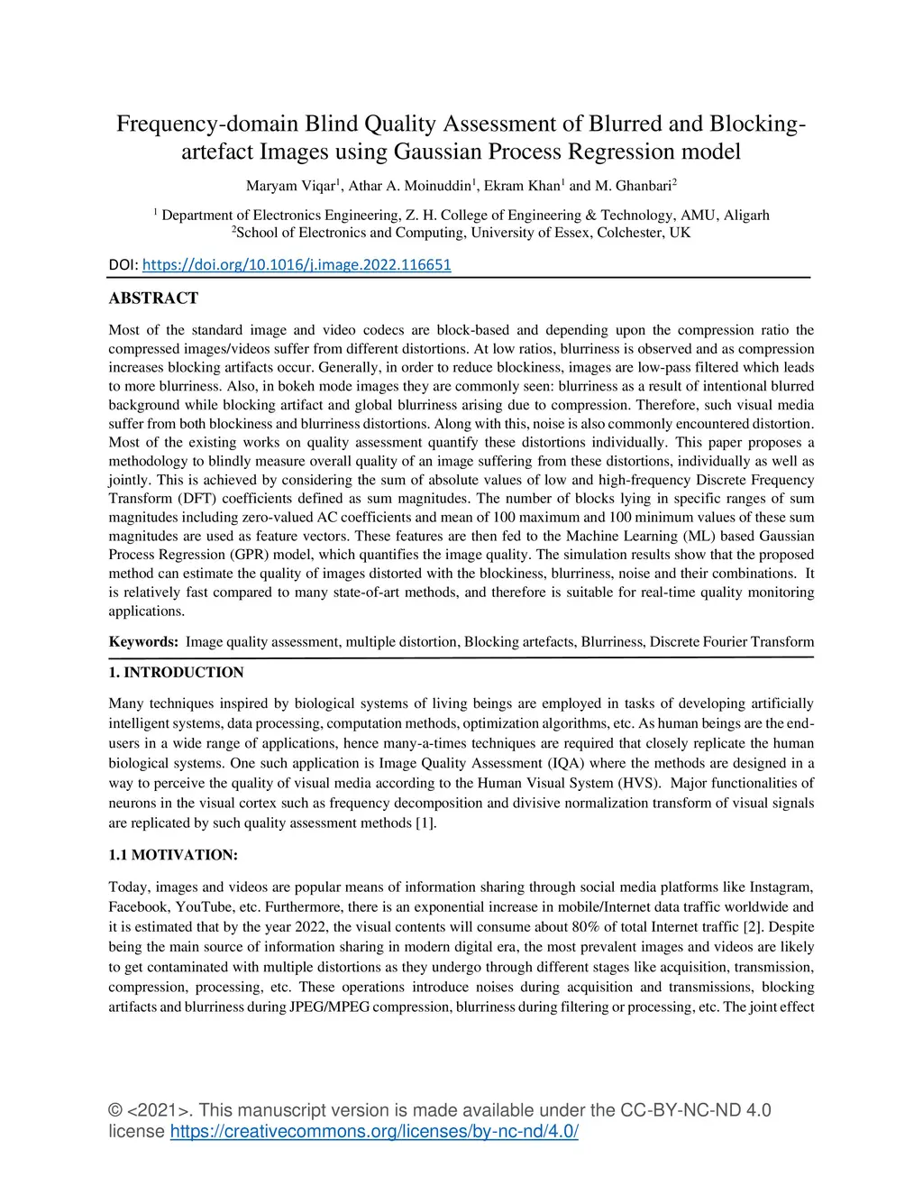 Most of the standard image and video codecs are block-based and depending upon the compression ratio the compressed images/videos suffer from different distortions. At low ratios, blurriness is observed and as compression increases blocking artifacts occur. Generally, in order to reduce blockiness, images are low-pass filtered which leads to more blurriness. Also, in bokeh mode images they are commonly seen: blurriness as a result of intentional blurred background while blocking artifact and global blurriness arising due to compression. Therefore, such visual media suffer from both blockiness and blurriness distortions. Along with this, noise is also commonly encountered distortion. Most of the existing works on quality assessment quantify these distortions individually. This paper proposes a methodology to blindly measure overall quality of an image suffering from these distortions, individually as well as jointly. This is achieved by considering the sum of absolute values of low and high-frequency Discrete Frequency Transform (DFT) coefficients defined as sum magnitudes. The number of blocks lying in specific ranges of sum magnitudes including zero-valued AC coefficients and mean of 100 maximum and 100 minimum values of these sum magnitudes are used as feature vectors. These features are then fed to the Machine Learning (ML) based Gaussian Process Regression (GPR) model, which quantifies the image quality. The simulation results show that the proposed method can estimate the quality of images distorted with the blockiness, blurriness, noise and their combinations. It is relatively fast compared to many state-of-art methods, and therefore is suitable for real-time quality monitoring applications.