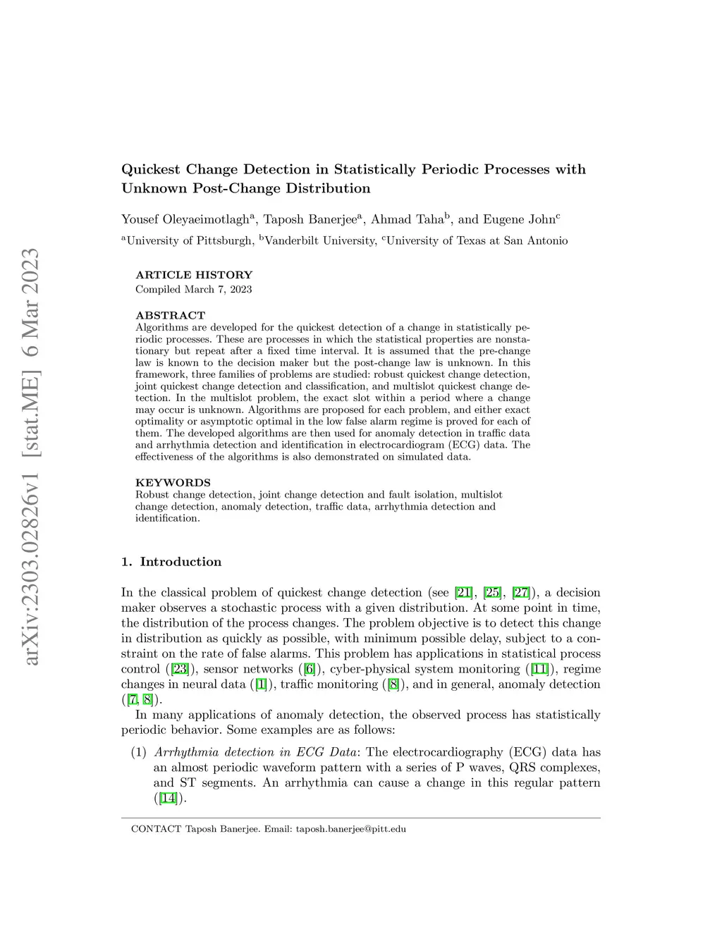 Algorithms are developed for the quickest detection of a change in statistically periodic processes. These are processes in which the statistical properties are nonstationary but repeat after a fixed time interval. It is assumed that the pre-change law is known to the decision maker but the post-change law is unknown. In this framework, three families of problems are studied: robust quickest change detection, joint quickest change detection and classification, and multislot quickest change detection. In the multislot problem, the exact slot within a period where a change may occur is unknown. Algorithms are proposed for each problem, and either exact optimality or asymptotic optimal in the low false alarm regime is proved for each of them. The developed algorithms are then used for anomaly detection in traffic data and arrhythmia detection and identification in electrocardiogram (ECG) data. The effectiveness of the algorithms is also demonstrated on simulated data.