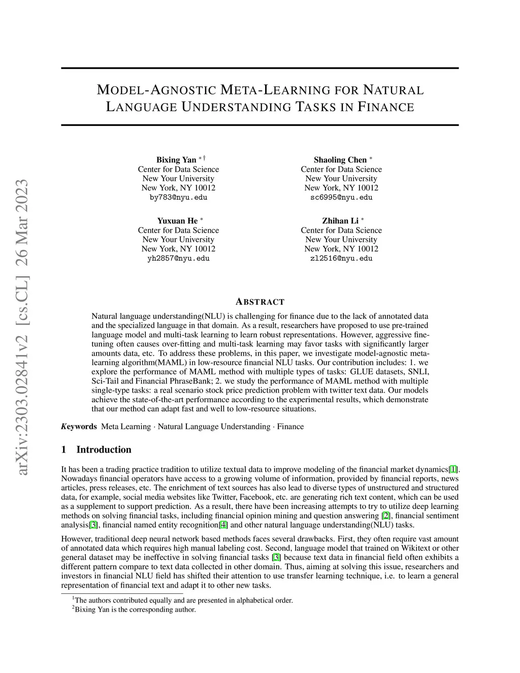 Natural language understanding(NLU) is challenging for finance due to the lack of annotated data and the specialized language in that domain. As a result, researchers have proposed to use pre-trained language model and multi-task learning to learn robust representations. However, aggressive fine-tuning often causes over-fitting and multi-task learning may favor tasks with significantly larger amounts data, etc. To address these problems, in this paper, we investigate model-agnostic meta-learning algorithm(MAML) in low-resource financial NLU tasks. Our contribution includes: 1. we explore the performance of MAML method with multiple types of tasks: GLUE datasets, SNLI, Sci-Tail and Financial PhraseBank; 2. we study the performance of MAML method with multiple single-type tasks: a real scenario stock price prediction problem with twitter text data. Our models achieve the state-of-the-art performance according to the experimental results, which demonstrate that our method can adapt fast and well to low-resource situations.