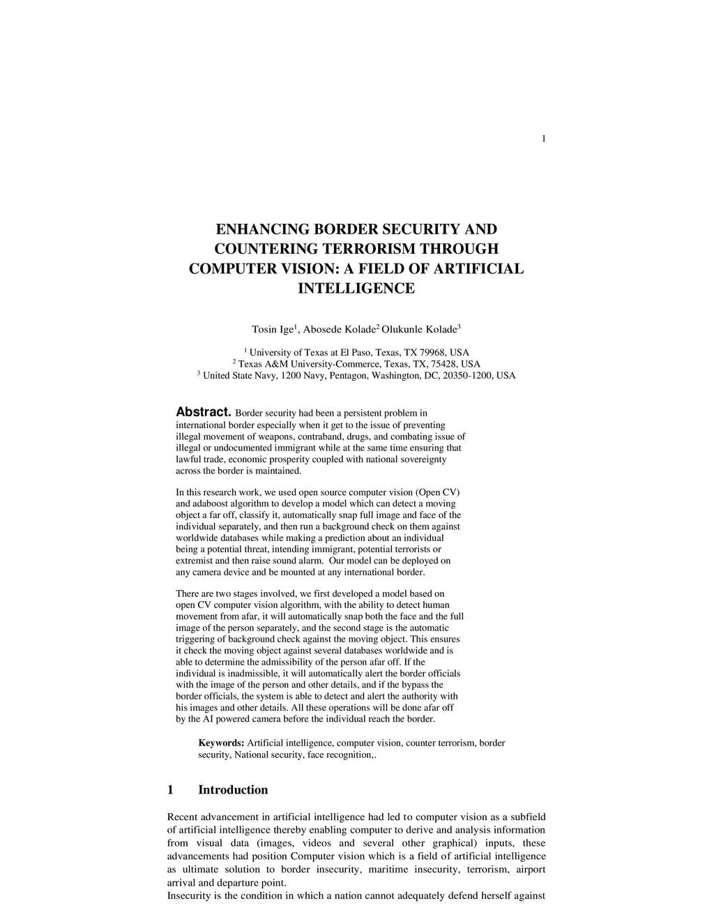 Border security had been a persistent problem in international border especially when it get to the issue of preventing illegal movement of weapons, contraband, drugs, and combating issue of illegal or undocumented immigrant while at the same time ensuring that lawful trade, economic prosperity coupled with national sovereignty across the border is maintained. In this research work, we used open source computer vision (Open CV) and adaboost algorithm to develop a model which can detect a moving object a far off, classify it, automatically snap full image and face of the individual separately, and then run a background check on them against worldwide databases while making a prediction about an individual being a potential threat, intending immigrant, potential terrorists or extremist and then raise sound alarm. Our model can be deployed on any camera device and be mounted at any international border. There are two stages involved, we first developed a model based on open CV computer vision algorithm, with the ability to detect human movement from afar, it will automatically snap both the face and the full image of the person separately, and the second stage is the automatic triggering of background check against the moving object. This ensures it check the moving object against several databases worldwide and is able to determine the admissibility of the person afar off. If the individual is inadmissible, it will automatically alert the border officials with the image of the person and other details, and if the bypass the border officials, the system is able to detect and alert the authority with his images and other details. All these operations will be done afar off by the AI powered camera before the individual reach the border