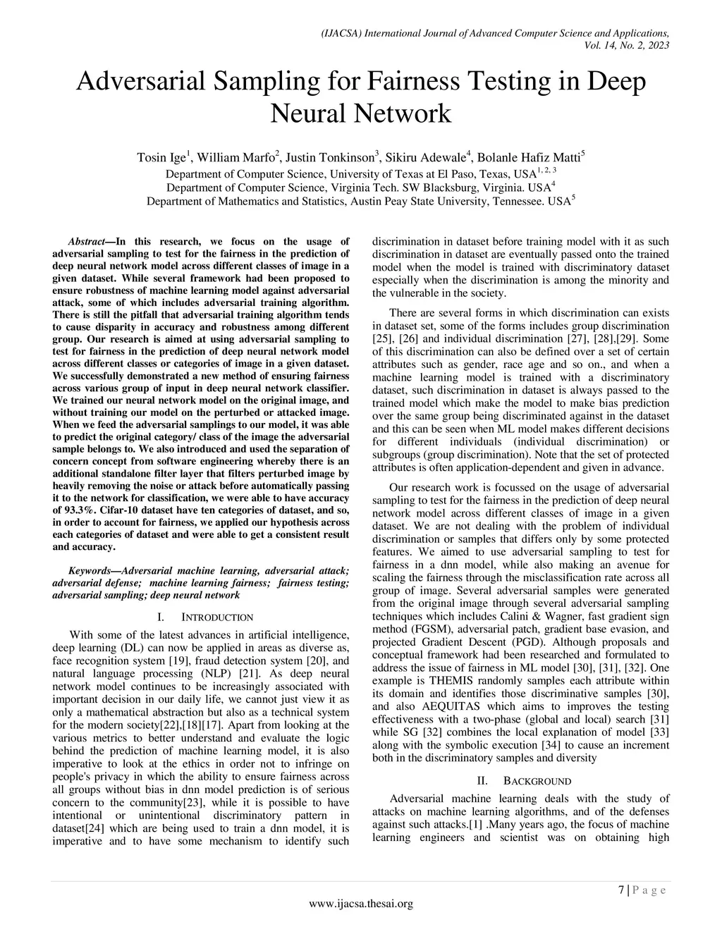 In this research, we focus on the usage of adversarial sampling to test for the fairness in the prediction of deep neural network model across different classes of image in a given dataset. While several framework had been proposed to ensure robustness of machine learning model against adversarial attack, some of which includes adversarial training algorithm. There is still the pitfall that adversarial training algorithm tends to cause disparity in accuracy and robustness among different group. Our research is aimed at using adversarial sampling to test for fairness in the prediction of deep neural network model across different classes or categories of image in a given dataset. We successfully demonstrated a new method of ensuring fairness across various group of input in deep neural network classifier. We trained our neural network model on the original image, and without training our model on the perturbed or attacked image. When we feed the adversarial samplings to our model, it was able to predict the original category/ class of the image the adversarial sample belongs to. We also introduced and used the separation of concern concept from software engineering whereby there is an additional standalone filter layer that filters perturbed image by heavily removing the noise or attack before automatically passing it to the network for classification, we were able to have accuracy of 93.3%. Cifar-10 dataset have ten categories of dataset, and so, in order to account for fairness, we applied our hypothesis across each categories of dataset and were able to get a consistent result and accuracy.