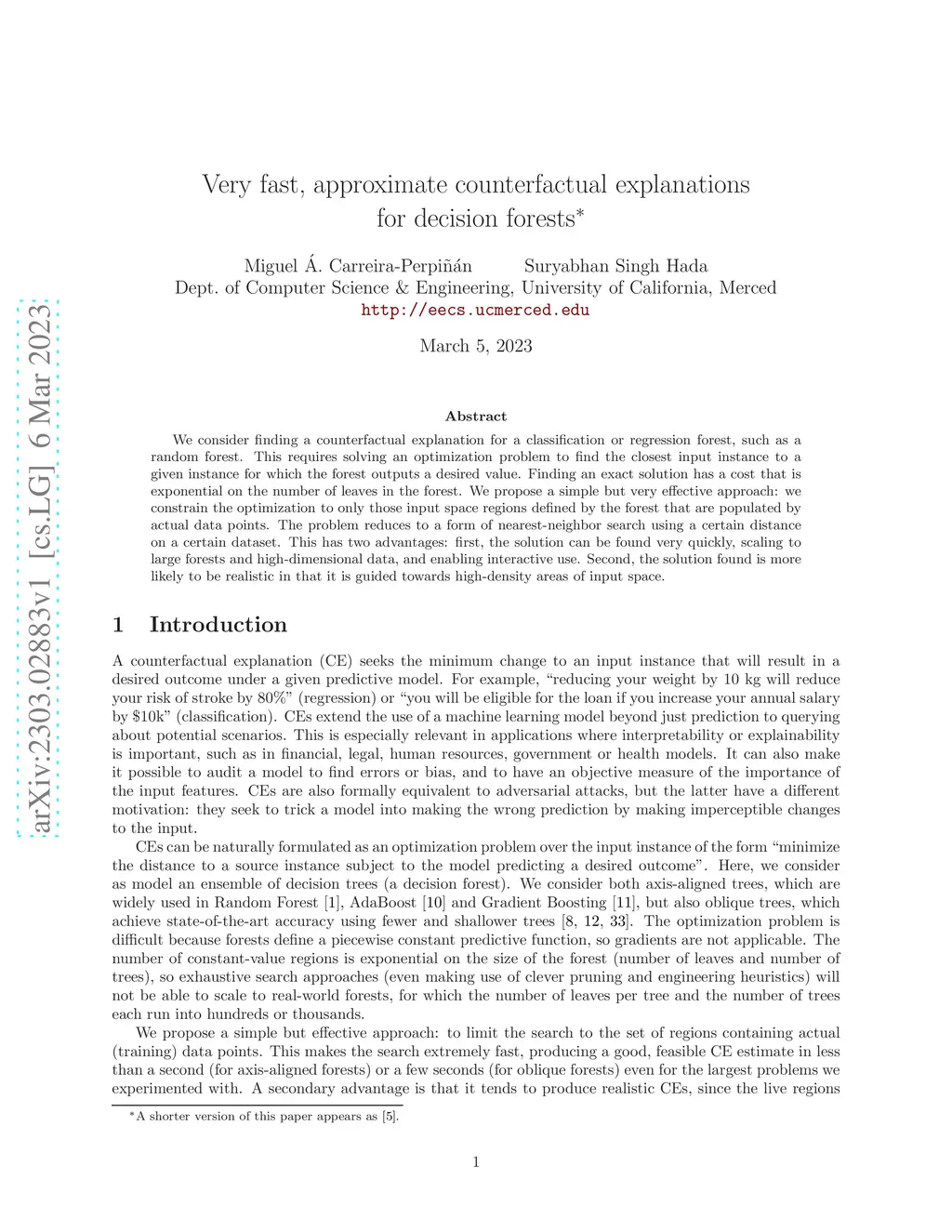 We consider finding a counterfactual explanation for a classification or regression forest, such as a random forest. This requires solving an optimization problem to find the closest input instance to a given instance for which the forest outputs a desired value. Finding an exact solution has a cost that is exponential on the number of leaves in the forest. We propose a simple but very effective approach: we constrain the optimization to only those input space regions defined by the forest that are populated by actual data points. The problem reduces to a form of nearest-neighbor search using a certain distance on a certain dataset. This has two advantages: first, the solution can be found very quickly, scaling to large forests and high-dimensional data, and enabling interactive use. Second, the solution found is more likely to be realistic in that it is guided towards high-density areas of input space.