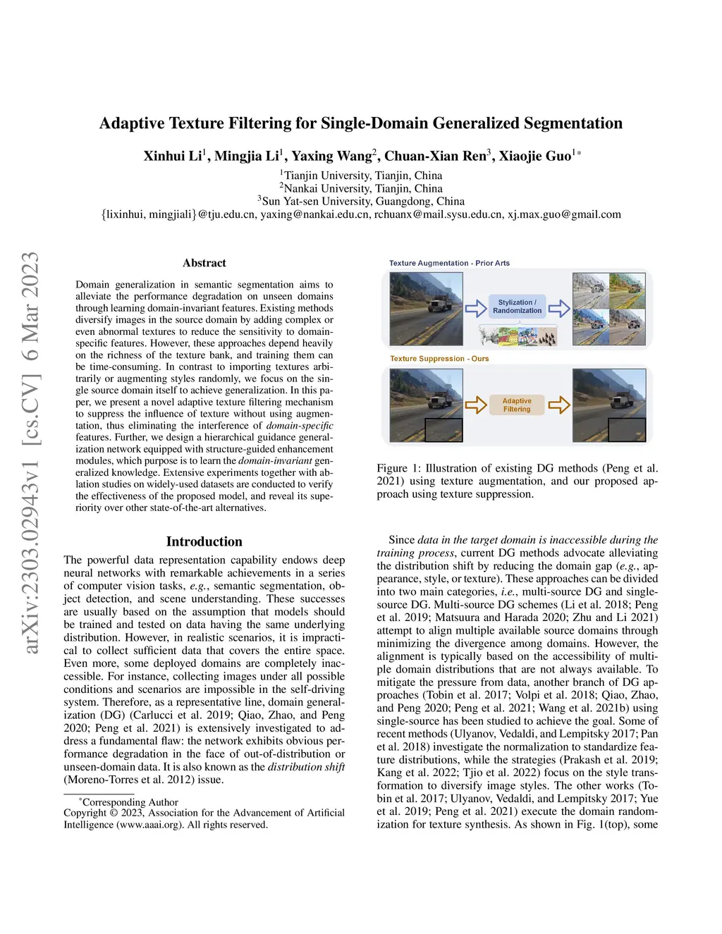 Domain generalization in semantic segmentation aims to alleviate the performance degradation on unseen domains through learning domain-invariant features. Existing methods diversify images in the source domain by adding complex or even abnormal textures to reduce the sensitivity to domain specific features. However, these approaches depend heavily on the richness of the texture bank, and training them can be time-consuming. In contrast to importing textures arbitrarily or augmenting styles randomly, we focus on the single source domain itself to achieve generalization. In this paper, we present a novel adaptive texture filtering mechanism to suppress the influence of texture without using augmentation, thus eliminating the interference of domain-specific features. Further, we design a hierarchical guidance generalization network equipped with structure-guided enhancement modules, which purpose is to learn the domain-invariant generalized knowledge. Extensive experiments together with ablation studies on widely-used datasets are conducted to verify the effectiveness of the proposed model, and reveal its superiority over other state-of-the-art alternatives.