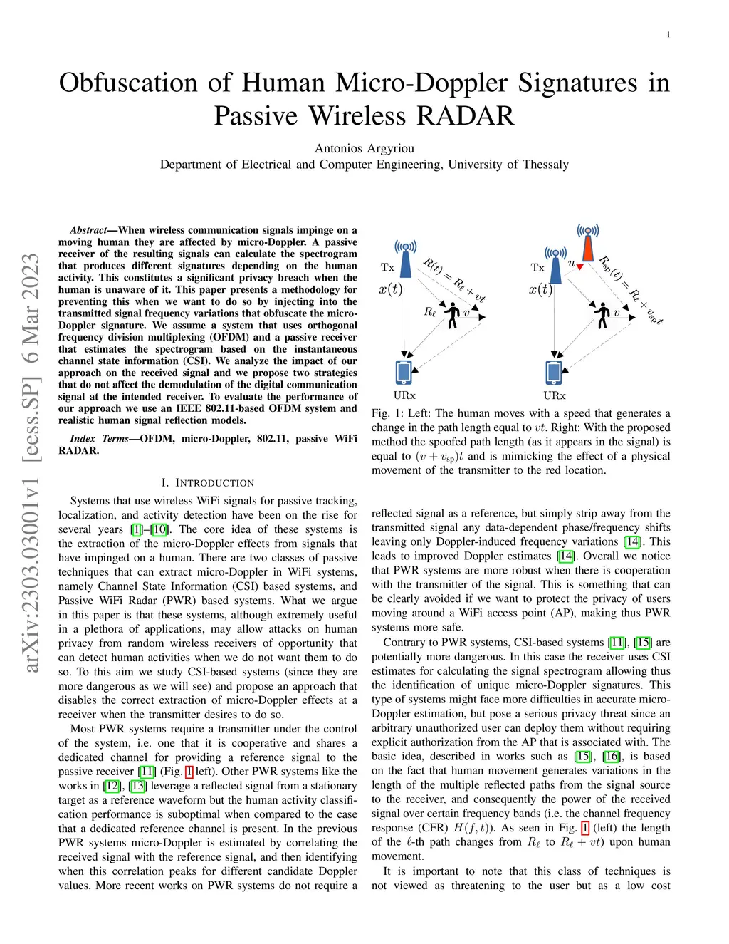 When wireless communication signals impinge on a moving human they are affected by micro-Doppler. A passive receiver of the resulting signals can calculate the spectrogram that produces different signatures depending on the human activity. This constitutes a significant privacy breach when the human is unaware of it. This paper presents a methodology for preventing this when we want to do so by injecting into the transmitted signal frequency variations that obfuscate the micro-Doppler signature. We assume a system that uses orthogonal frequency division multiplexing (OFDM) and a passive receiver that estimates the spectrogram based on the instantaneous channel state information (CSI). We analyze the impact of our approach on the received signal and we propose two strategies that do not affect the demodulation of the digital communication signal at the intended receiver. To evaluate the performance of our approach we use an IEEE 802.11-based OFDM system and realistic human signal reflection models.