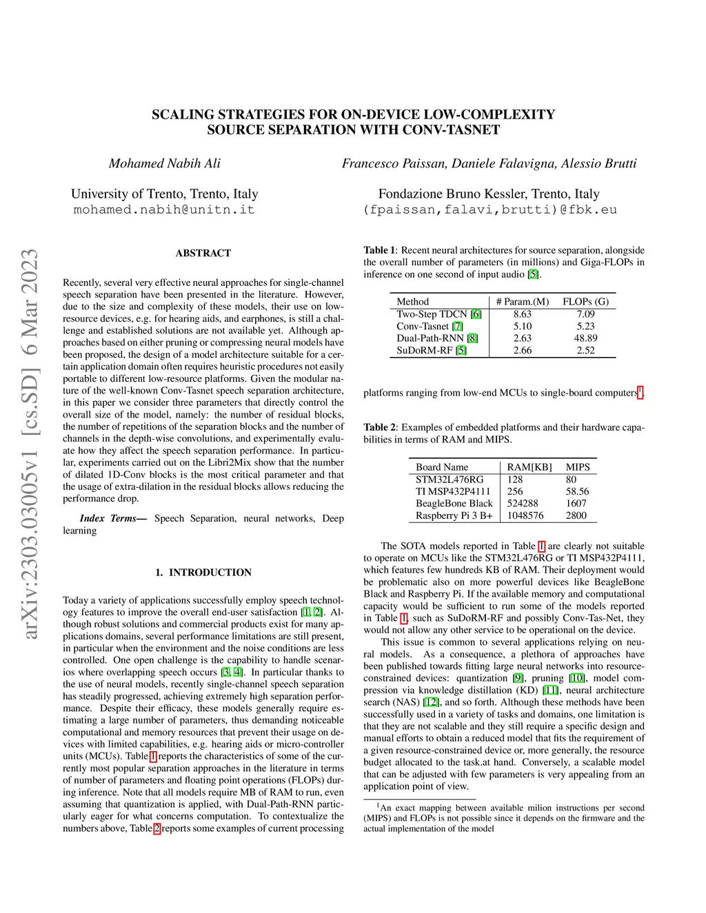 Recently, several very effective neural approaches for single-channel speech separation have been presented in the literature. However, due to the size and complexity of these models, their use on low-resource devices, e.g. for hearing aids, and earphones, is still a challenge and established solutions are not available yet. Although approaches based on either pruning or compressing neural models have been proposed, the design of a model architecture suitable for a certain application domain often requires heuristic procedures not easily portable to different low-resource platforms. Given the modular nature of the well-known Conv-Tasnet speech separation architecture, in this paper we consider three parameters that directly control the overall size of the model, namely: the number of residual blocks, the number of repetitions of the separation blocks and the number of channels in the depth-wise convolutions, and experimentally evaluate how they affect the speech separation performance. In particular, experiments carried out on the Libri2Mix show that the number of dilated 1D-Conv blocks is the most critical parameter and that the usage of extra-dilation in the residual blocks allows reducing the performance drop.