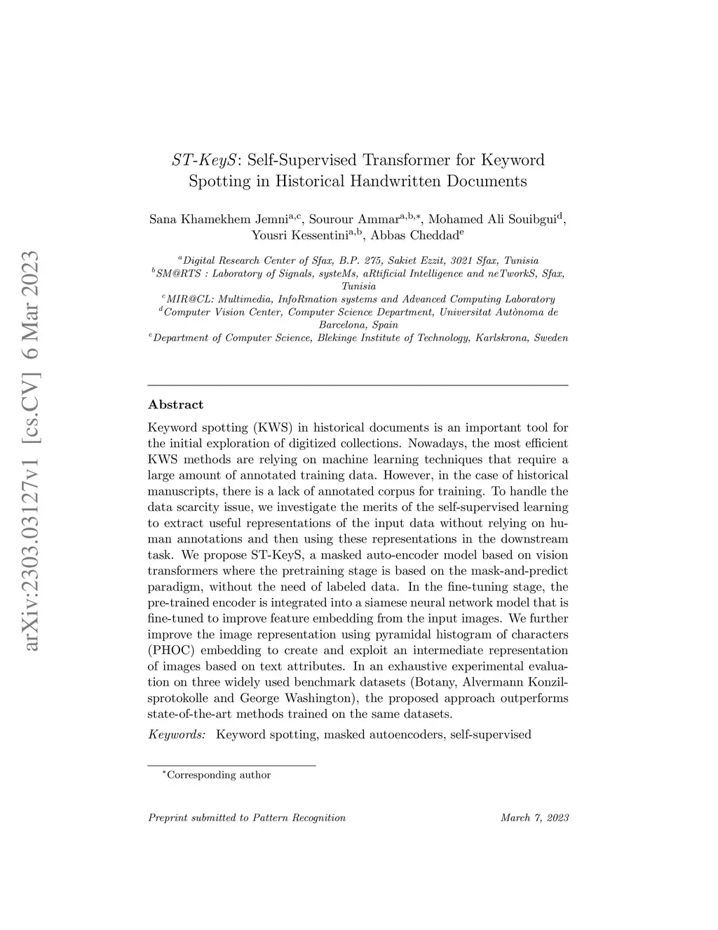 ST-KeyS: Self-Supervised Transformer for Keyword Spotting in Historical