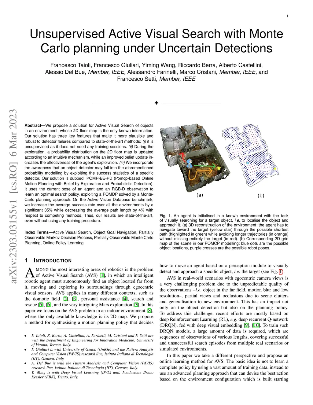 We propose a solution for Active Visual Search of objects in an environment, whose 2D floor map is the only known information. Our solution has three key features that make it more plausible and robust to detector failures compared to state-of-the-art methods: (i) it is unsupervised as it does not need any training sessions. (ii) During the exploration, a probability distribution on the 2D floor map is updated according to an intuitive mechanism, while an improved belief update increases the effectiveness of the agent's exploration. (iii) We incorporate the awareness that an object detector may fail into the aforementioned probability modelling by exploiting the success statistics of a specific detector. Our solution is dubbed POMP-BE-PD (Pomcp-based Online Motion Planning with Belief by Exploration and Probabilistic Detection). It uses the current pose of an agent and an RGB-D observation to learn an optimal search policy, exploiting a POMDP solved by a Monte-Carlo planning approach. On the Active Vision Database benchmark, we increase the average success rate over all the environments by a significant 35% while decreasing the average path length by 4% with respect to competing methods. Thus, our results are state-of-the-art, even without using any training procedure.