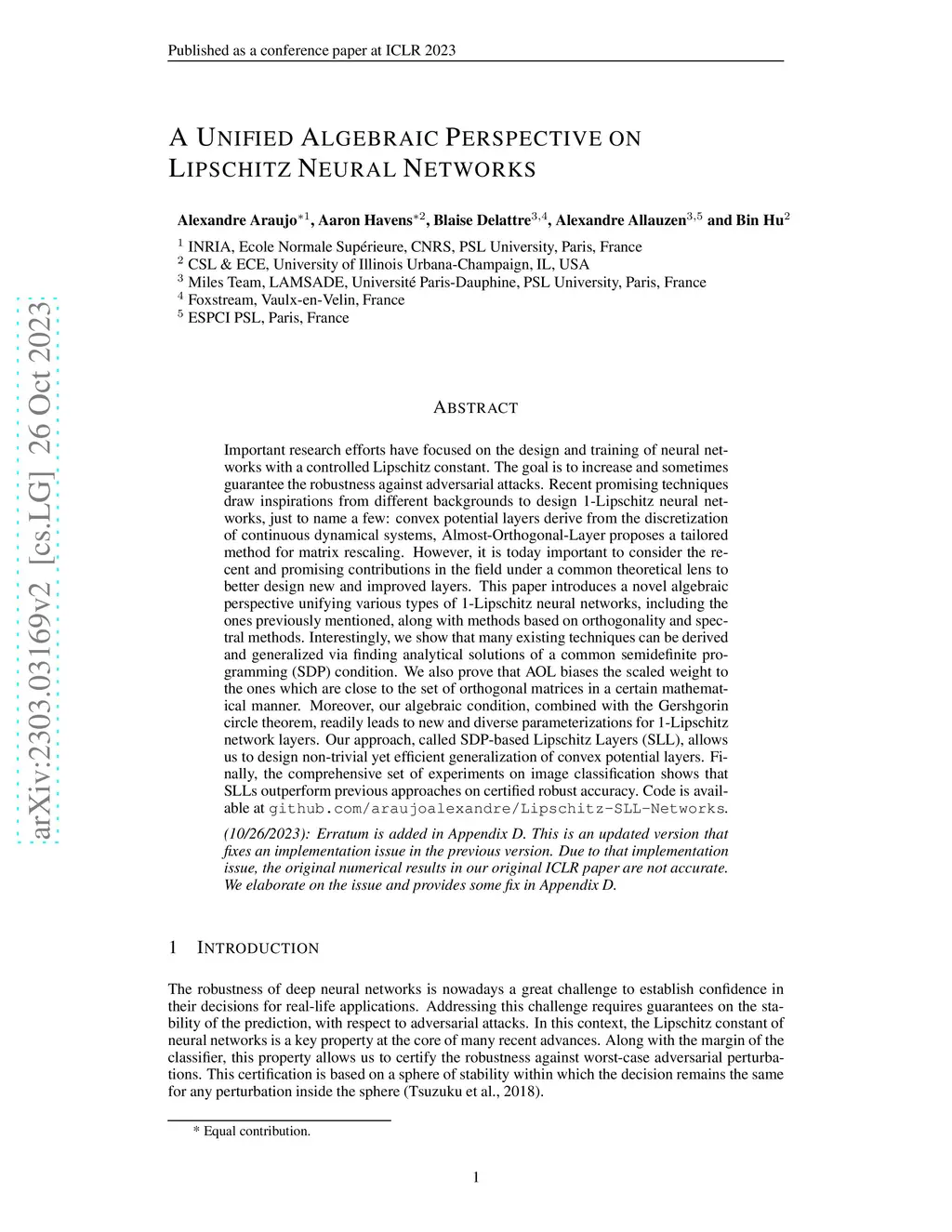 Important research efforts have focused on the design and training of neural networks with a controlled Lipschitz constant. The goal is to increase and sometimes guarantee the robustness against adversarial attacks. Recent promising techniques draw inspirations from different backgrounds to design 1-Lipschitz neural networks, just to name a few: convex potential layers derive from the discretization of continuous dynamical systems, Almost-Orthogonal-Layer proposes a tailored method for matrix rescaling. However, it is today important to consider the recent and promising contributions in the field under a common theoretical lens to better design new and improved layers. This paper introduces a novel algebraic perspective unifying various types of 1-Lipschitz neural networks, including the ones previously mentioned, along with methods based on orthogonality and spectral methods. Interestingly, we show that many existing techniques can be derived and generalized via finding analytical solutions of a common semidefinite programming (SDP) condition. We also prove that AOL biases the scaled weight to the ones which are close to the set of orthogonal matrices in a certain mathematical manner. Moreover, our algebraic condition, combined with the Gershgorin circle theorem, readily leads to new and diverse parameterizations for 1-Lipschitz network layers. Our approach, called SDP-based Lipschitz Layers (SLL), allows us to design non-trivial yet efficient generalization of convex potential layers. Finally, the comprehensive set of experiments on image classification shows that SLLs outperform previous approaches on certified robust accuracy. Code is available at https://github.com/araujoalexandre/Lipschitz-SLL-Networks.