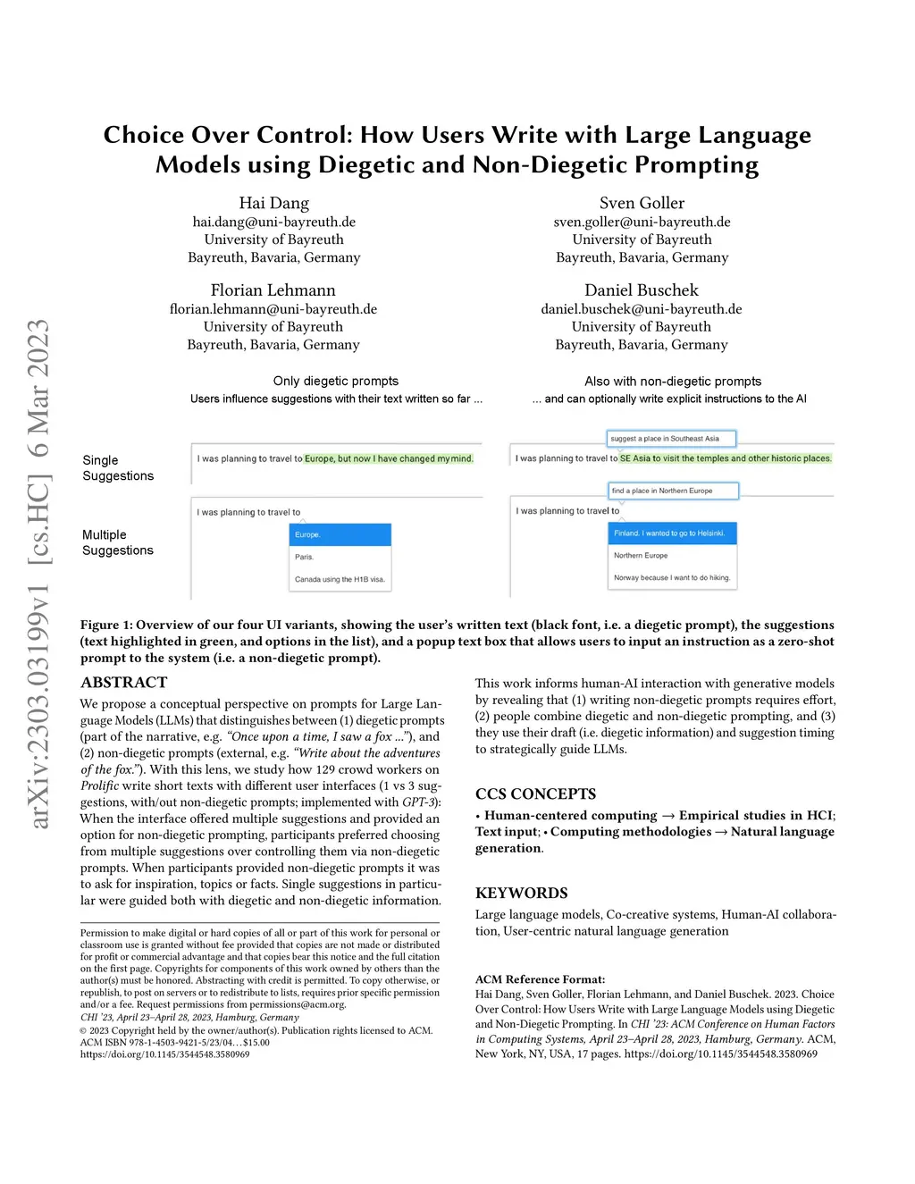 We propose a conceptual perspective on prompts for Large Language Models (LLMs) that distinguishes between (1) diegetic prompts (part of the narrative, e.g. "Once upon a time, I saw a fox..."), and (2) non-diegetic prompts (external, e.g. "Write about the adventures of the fox."). With this lens, we study how 129 crowd workers on Prolific write short texts with different user interfaces (1 vs 3 suggestions, with/out non-diegetic prompts; implemented with GPT-3): When the interface offered multiple suggestions and provided an option for non-diegetic prompting, participants preferred choosing from multiple suggestions over controlling them via non-diegetic prompts. When participants provided non-diegetic prompts it was to ask for inspiration, topics or facts. Single suggestions in particular were guided both with diegetic and non-diegetic information. This work informs human-AI interaction with generative models by revealing that (1) writing non-diegetic prompts requires effort, (2) people combine diegetic and non-diegetic prompting, and (3) they use their draft (i.e. diegetic information) and suggestion timing to strategically guide LLMs.