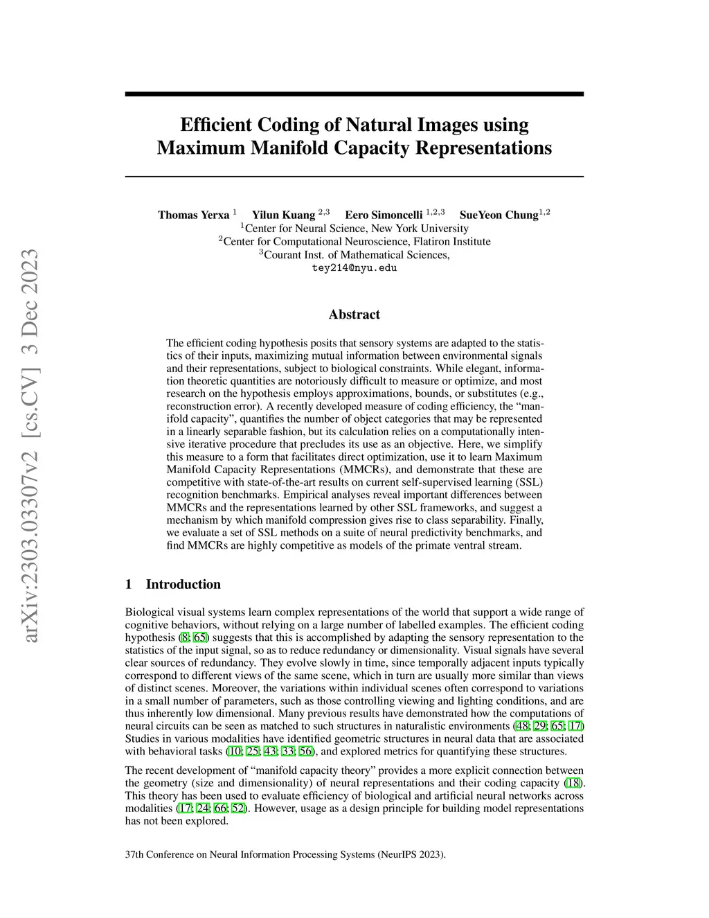 The efficient coding hypothesis proposes that the response properties of sensory systems are adapted to the statistics of their inputs such that they capture maximal information about the environment, subject to biological constraints. While elegant, information theoretic properties are notoriously difficult to measure in practical settings or to employ as objective functions in optimization. This difficulty has necessitated that computational models designed to test the hypothesis employ several different information metrics ranging from approximations and lower bounds to proxy measures like reconstruction error. Recent theoretical advances have characterized a novel and ecologically relevant efficiency metric, the manifold capacity, which is the number of object categories that may be represented in a linearly separable fashion. However, calculating manifold capacity is a computationally intensive iterative procedure that until now has precluded its use as an objective. Here we outline the simplifying assumptions that allow manifold capacity to be optimized directly, yielding Maximum Manifold Capacity Representations (MMCR). The resulting method is closely related to and inspired by advances in the field of self supervised learning (SSL), and we demonstrate that MMCRs are competitive with state of the art results on standard SSL benchmarks. Empirical analyses reveal differences between MMCRs and representations learned by other SSL frameworks, and suggest a mechanism by which manifold compression gives rise to class separability. Finally we evaluate a set of SSL methods on a suite of neural predictivity benchmarks, and find MMCRs are higly competitive as models of the ventral stream.
