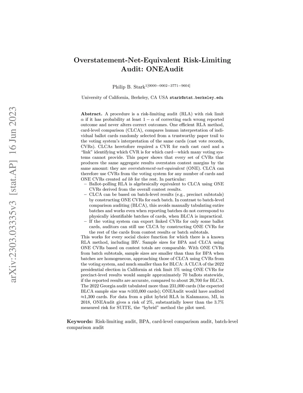 Overstatement-Net-Equivalent Risk-Limiting Audit: ONEAudit