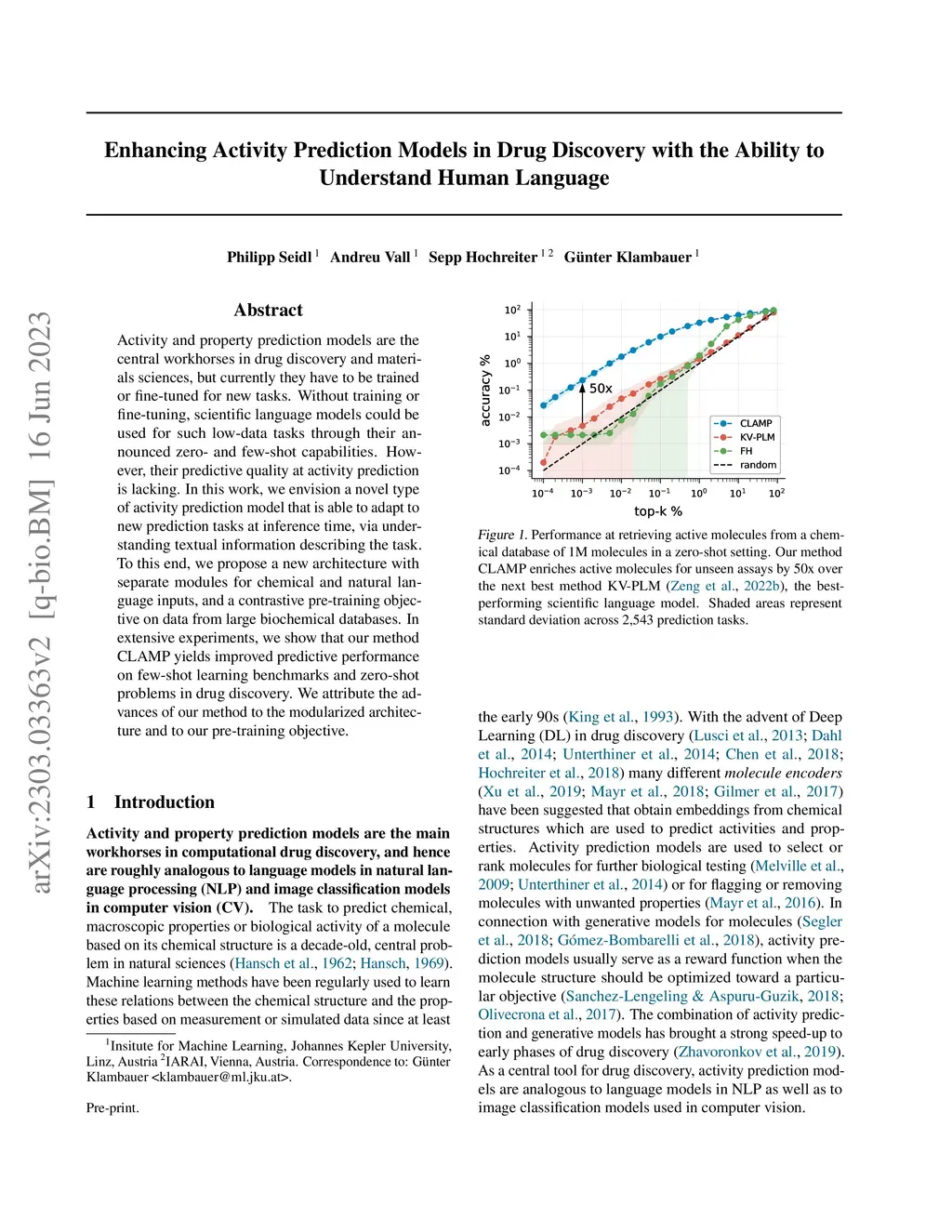 Activity and property prediction models are the central workhorses in drug discovery and materials sciences, but currently they have to be trained or fine-tuned for new tasks. Without training or fine-tuning, scientific language models could be used for such low-data tasks through their announced zero- and few-shot capabilities. However, their predictive quality at activity prediction is lacking. In this work, we envision a novel type of activity prediction model that is able to adapt to new prediction tasks at inference time, via understanding textual information describing the task. To this end, we propose a new architecture with separate modules for chemical and natural language inputs, and a contrastive pre-training objective on data from large biochemical databases. In extensive experiments, we show that our method CLAMP yields improved predictive performance on few-shot learning benchmarks and zero-shot problems in drug discovery. We attribute the advances of our method to the modularized architecture and to our pre-training objective.