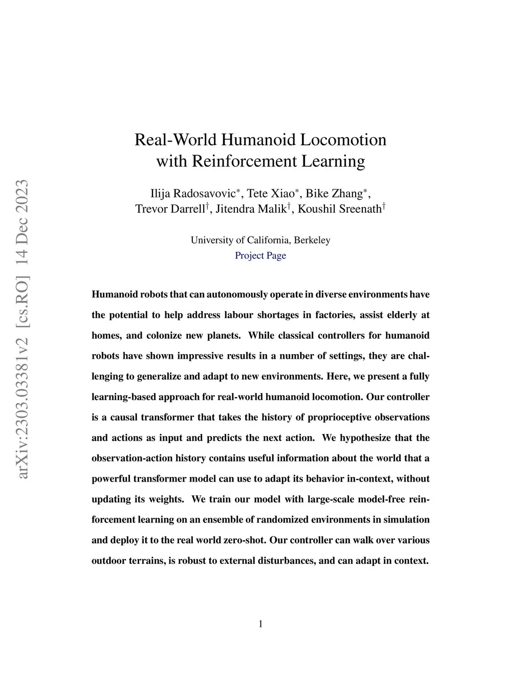 Humanoid robots that can autonomously operate in diverse environments have the potential to help address labour shortages in factories, assist elderly at homes, and colonize new planets. While classical controllers for humanoid robots have shown impressive results in a number of settings, they are challenging to generalize and adapt to new environments. Here, we present a fully learning-based approach for real-world humanoid locomotion. Our controller is a causal transformer that takes the history of proprioceptive observations and actions as input and predicts the next action. We hypothesize that the observation-action history contains useful information about the world that a powerful transformer model can use to adapt its behavior in-context, without updating its weights. We train our model with large-scale model-free reinforcement learning on an ensemble of randomized environments in simulation and deploy it to the real world zero-shot. Our controller can walk over various outdoor terrains, is robust to external disturbances, and can adapt in context.