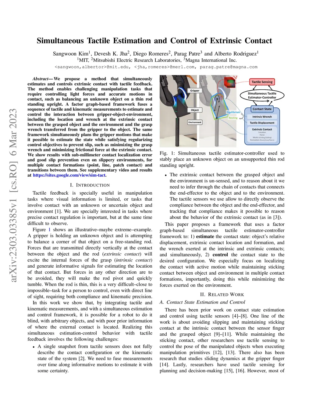 We propose a method that simultaneously estimates and controls extrinsic contact with tactile feedback. The method enables challenging manipulation tasks that require controlling light forces and accurate motions in contact, such as balancing an unknown object on a thin rod standing upright. A factor graph-based framework fuses a sequence of tactile and kinematic measurements to estimate and control the interaction between gripper-object-environment, including the location and wrench at the extrinsic contact between the grasped object and the environment and the grasp wrench transferred from the gripper to the object. The same framework simultaneously plans the gripper motions that make it possible to estimate the state while satisfying regularizing control objectives to prevent slip, such as minimizing the grasp wrench and minimizing frictional force at the extrinsic contact. We show results with sub-millimeter contact localization error and good slip prevention even on slippery environments, for multiple contact formations (point, line, patch contact) and transitions between them. See supplementary video and results at https://sites.google.com/view/sim-tact.