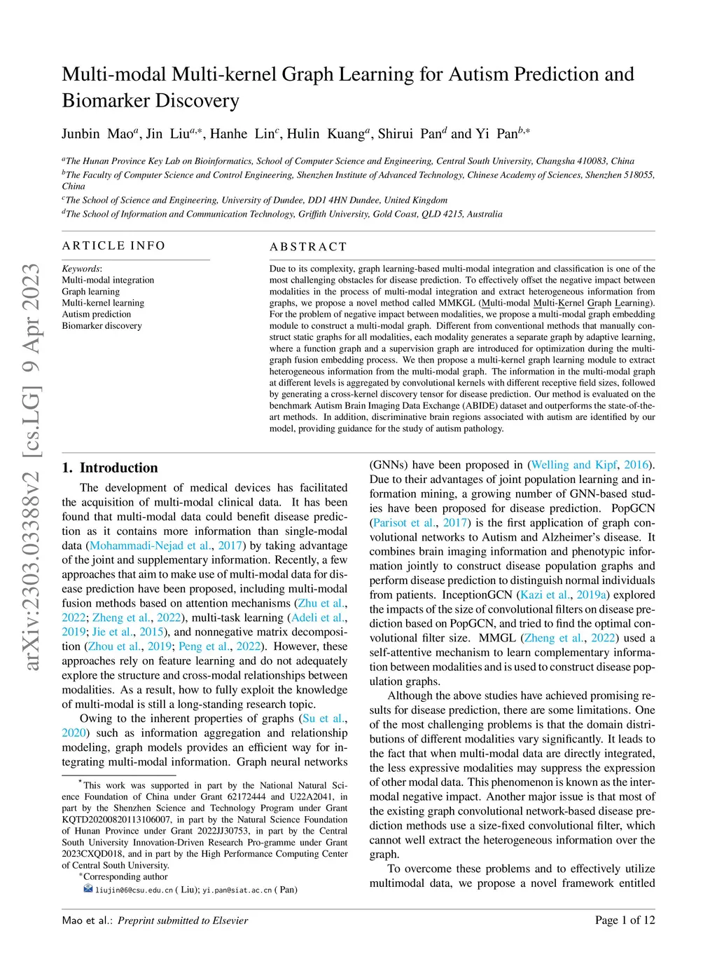 Multi-modal Multi-kernel Graph Learning for Autism Prediction and Biomarker Discovery